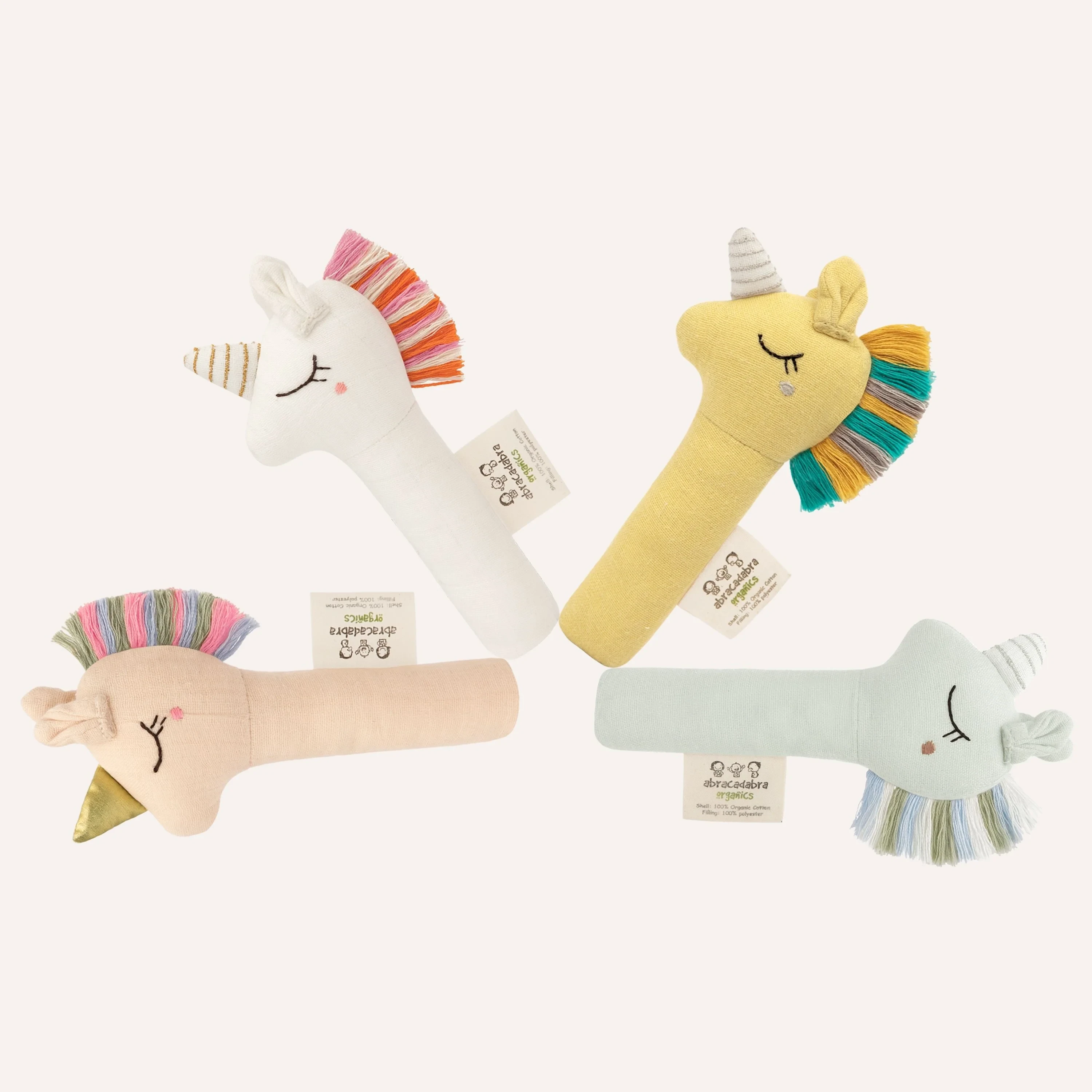 Bring a sprinkle of whimsy to your baby’s playtime with our Unicorn Hand Rattle, made from 100% organic cotton muslin and filled with soft hypoallergenic fiber. The textured mane, made from colorful threads, offers a gentle tactile experience, while the soft rattle sound supports auditory development. Designed for little hands to hold, shake, and explore, this charming rattle stimulates multiple senses while offering a comforting presence. Whether for gifting or everyday play, this unicorn adds magic to every moment. Available in four pastel shades, it’s a keepsake you’ll treasure as much as they do.