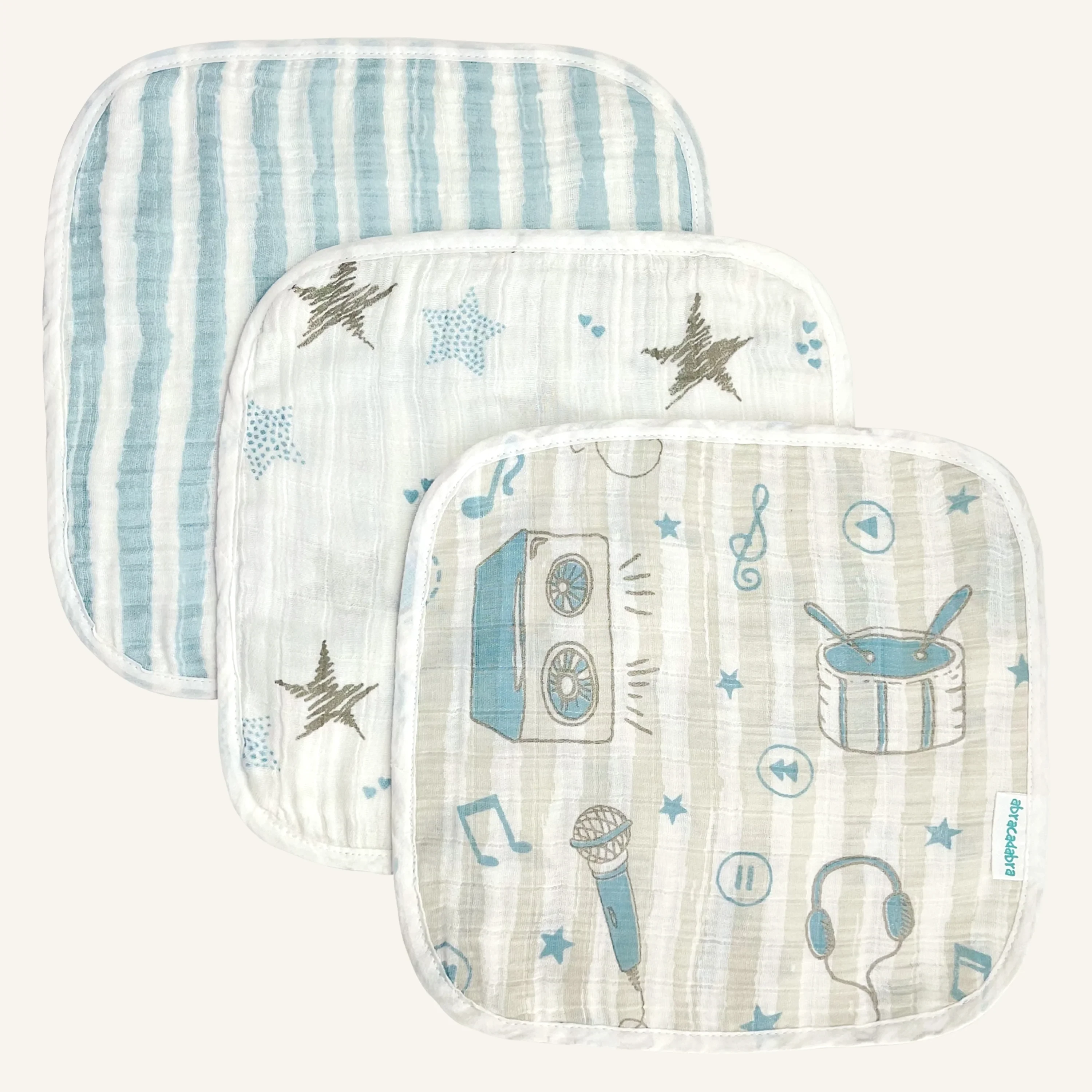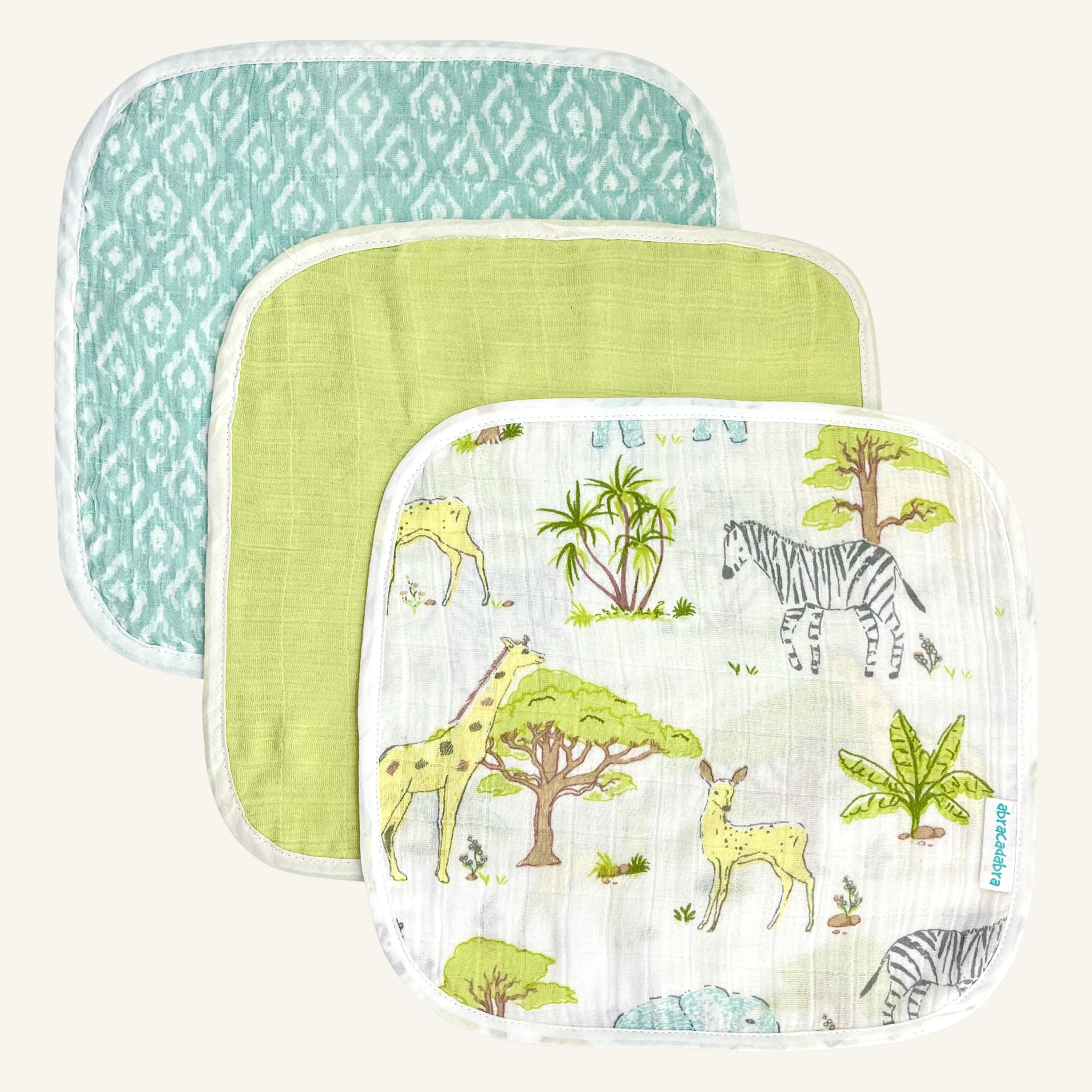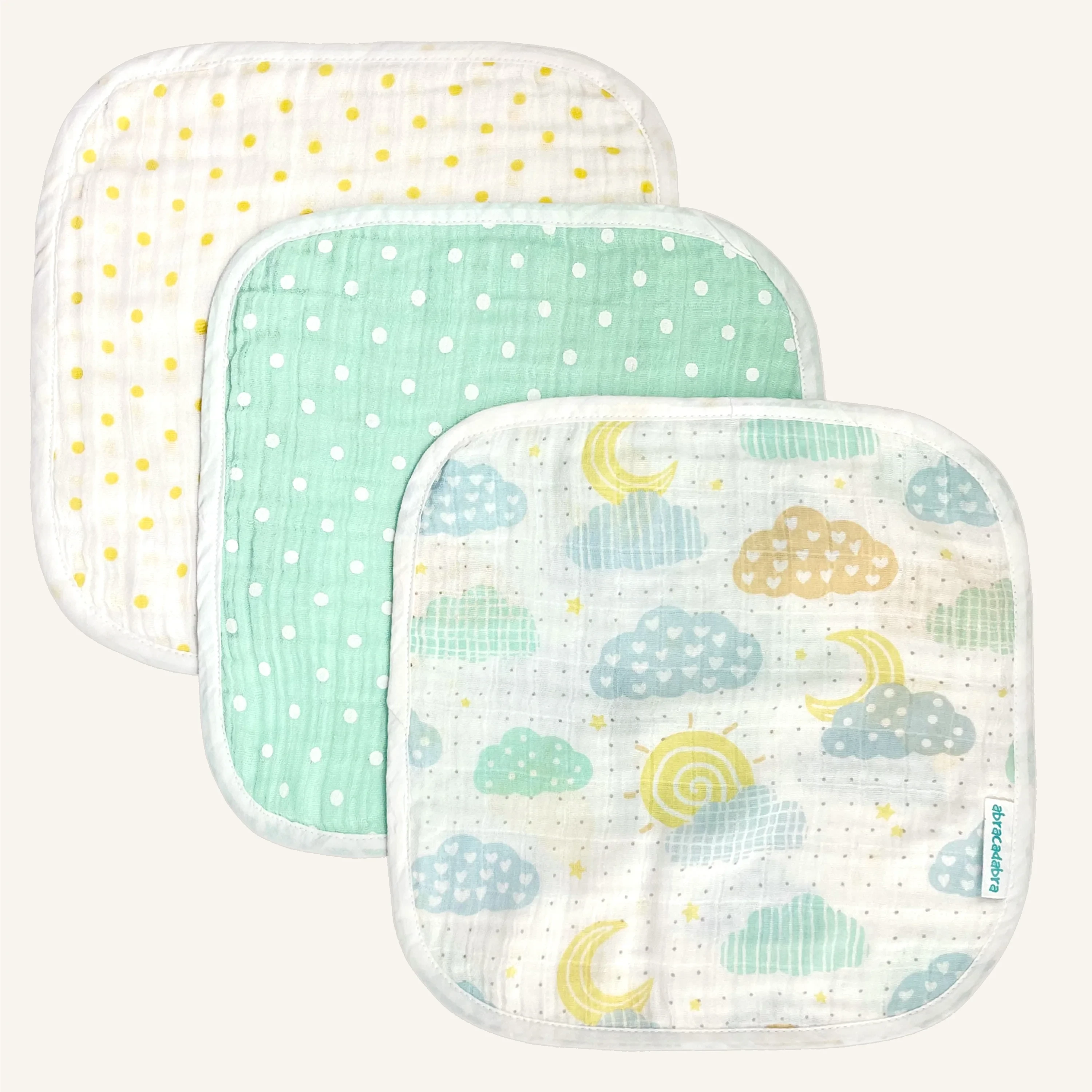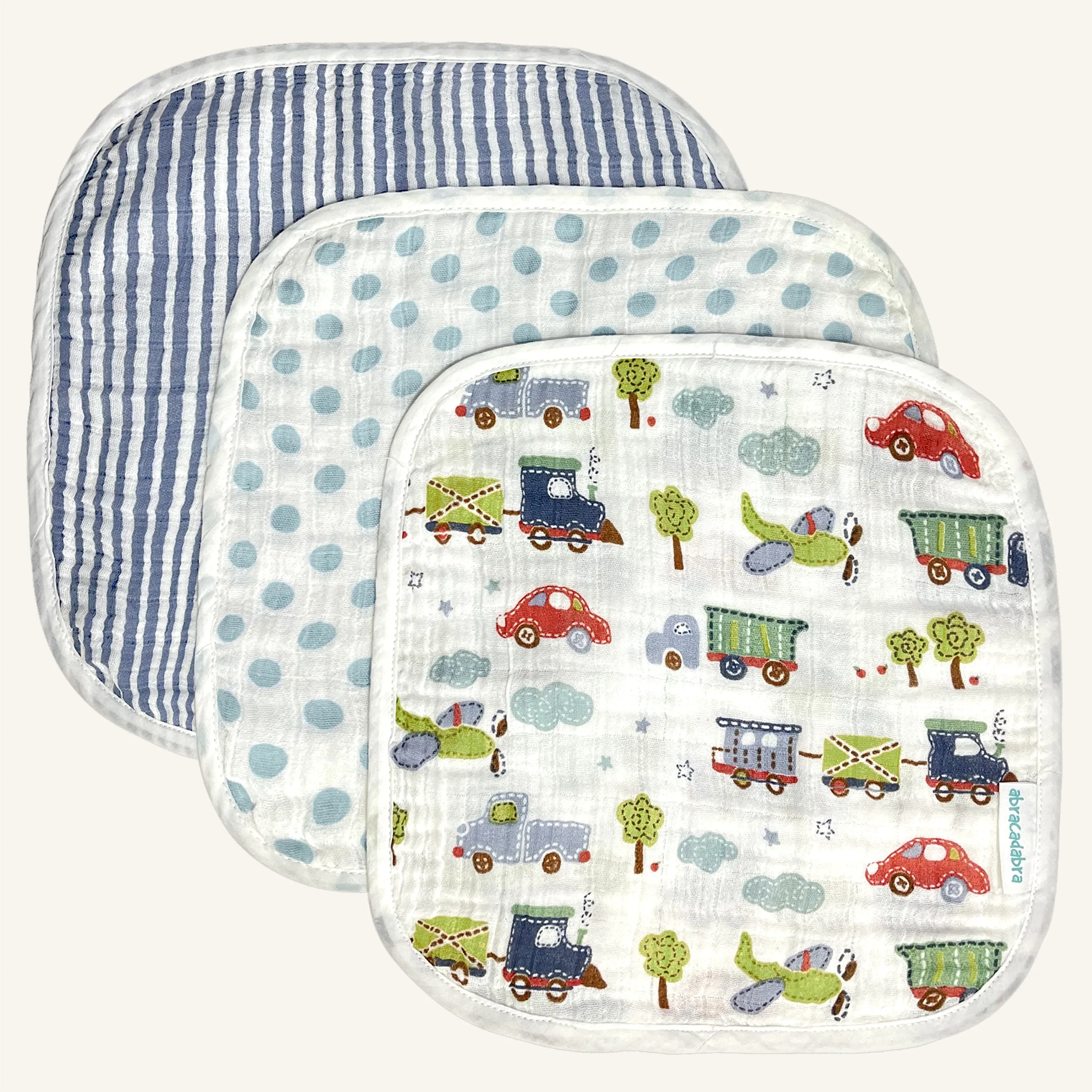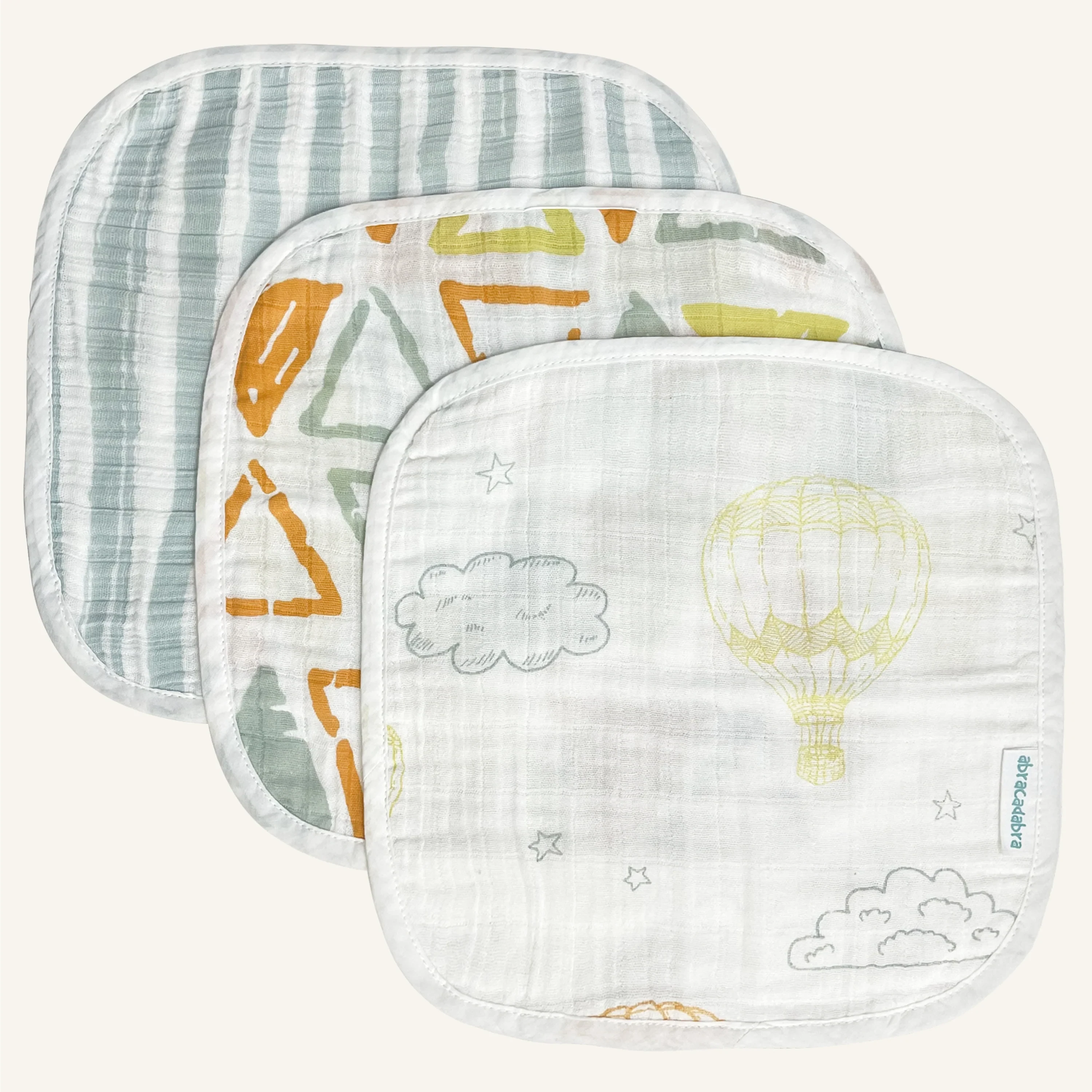 Our face wipes are crafted from 100% natural muslin fabric, ensuring a soft and gentle touch on the baby's skin. They are hypo allergenic, delicate and get softer with every wash; making them ideal for new borns and toddlers. The wipes are absorbent and make sure meal-time remains clean and tidy. Available in a variety of colourful themes and designs