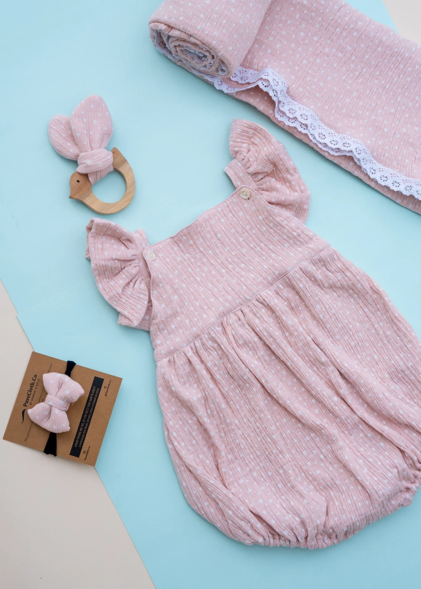 Swaddle:  Organic cotton swaddle with a soft cotton lace border. Perfect for snug swaddling in the early months, and versatile enough to be used later as a light blanket, stroller cover, or comfort layer.
