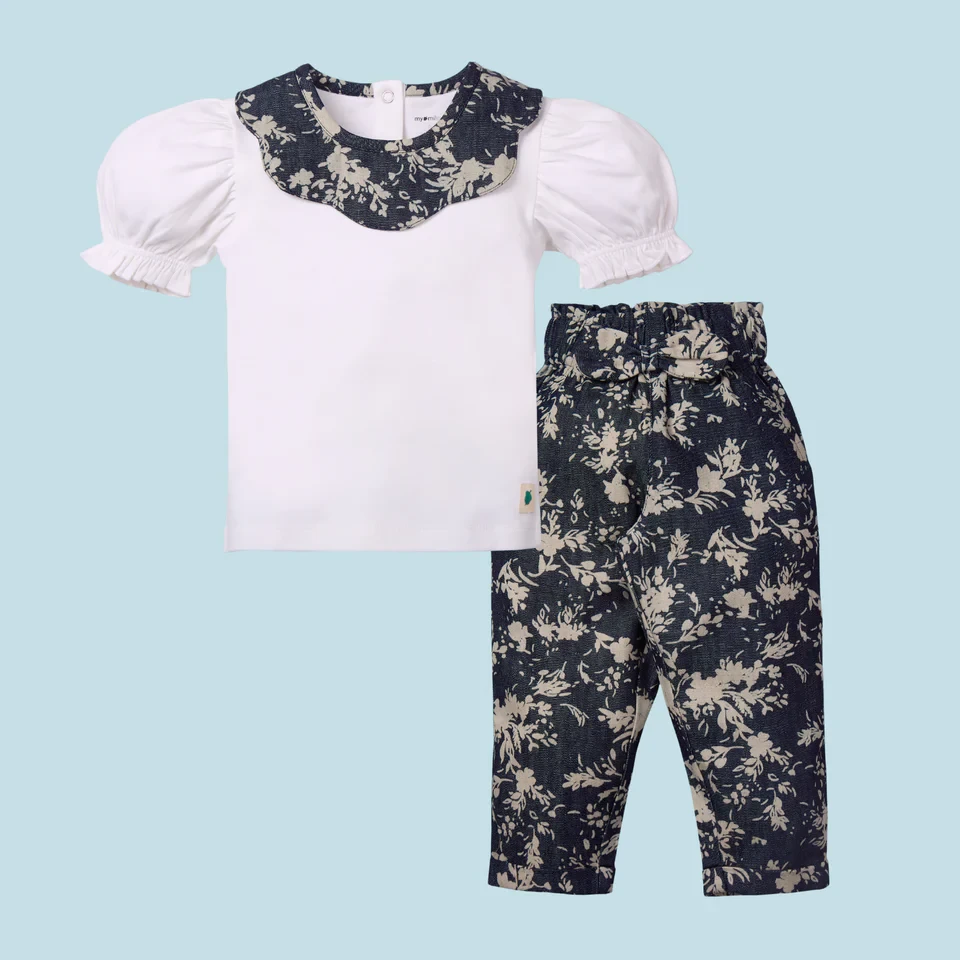 Elevate your little one’s style with the My Milestones Bijou Co-Ord Set. Crafted from soft, breathable cotton, this two-piece outfit pairs a puff-sleeve white top with a printed denim collar and matching high-waist pants—perfect for playdates, outings, or casual celebrations.