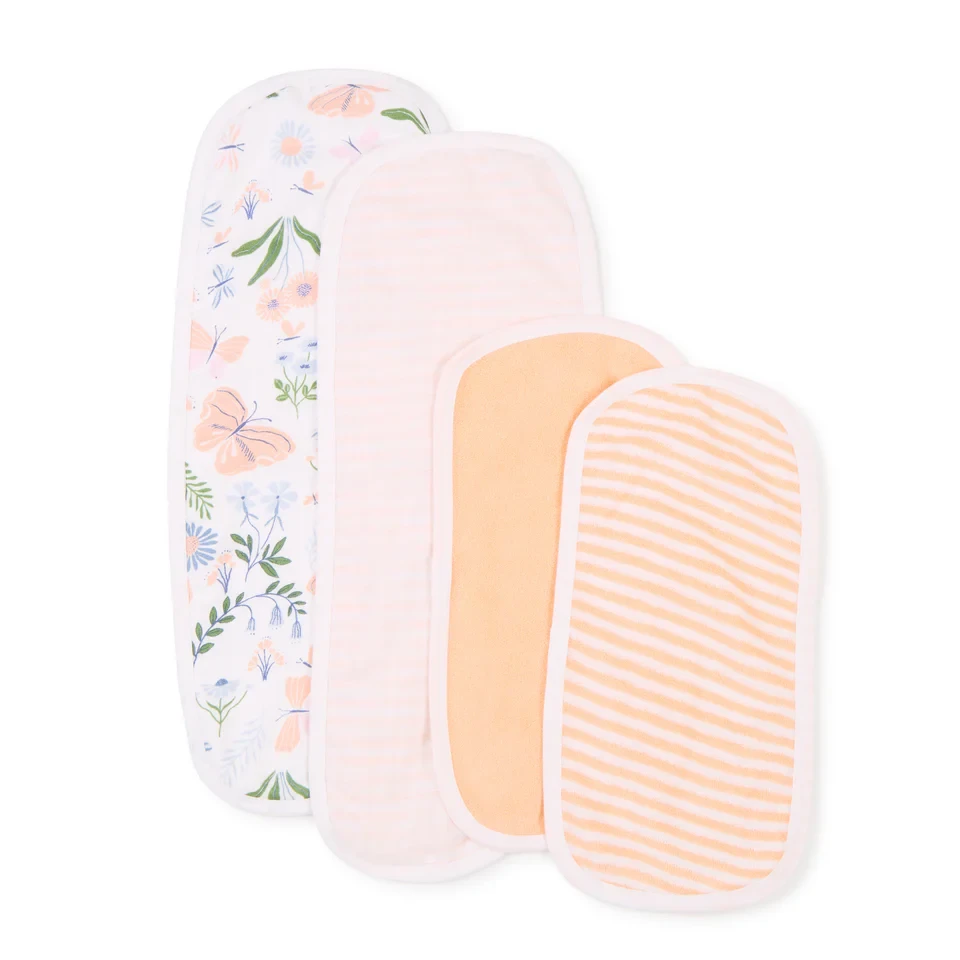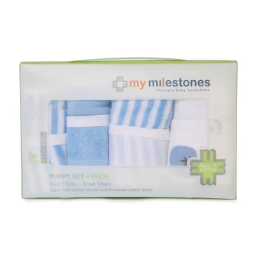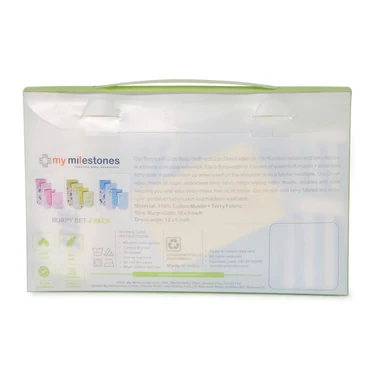 My Milestones Burpy Set is 100% cotton muslin+100% cotton terry, which is a handy everyday essential that stands up to daily use. The soft burp cloth is 2-layered cotton muslin and absorbent terry does a gentle and quick clean-up. The drooler wipe made of super absorbent 100% cotton terry wipes baby drools, dribbles, and spills, keeping you and your baby mess-free at all times. The muslin and terry fabrics are easy care, gentle on baby's skin, and machine washable. Use the Burpy set, on the shoulder as a burp cloth or as a bib for mealtime, and the drooler wipe to wipe up baby drool or spills. A diaper bag essential, fits in any bag.