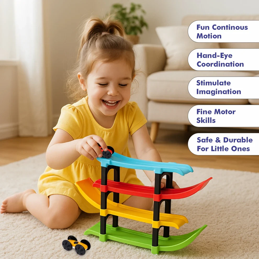 Chanak Ramp Racer Track is a fun, engaging ramp car game designed to encourage active play and early learning in toddlers. Made from high-quality, non-toxic ABS plastic, this colourful toy car ramp provides a safe and smooth play experience for children aged 2 to 3 years. Inspired by racing roads, it allows kids to enjoy exciting car races while exploring movement and speed through play.