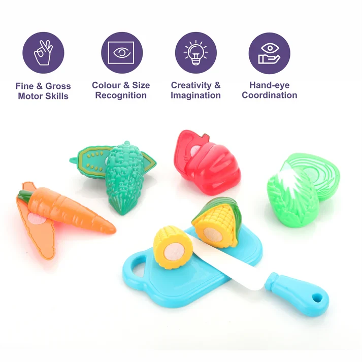 This interactive fruits and vegetables toy set encourages imaginative role-play and helps develop hand-eye coordination, colour perception, fine motor skills, and chopping skills. Each vegetable is cut into halves and joined with Velcro, making it easy for kids to attach, detach, and repeat the activity again and again for realistic play.