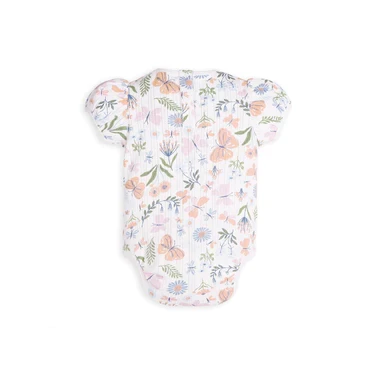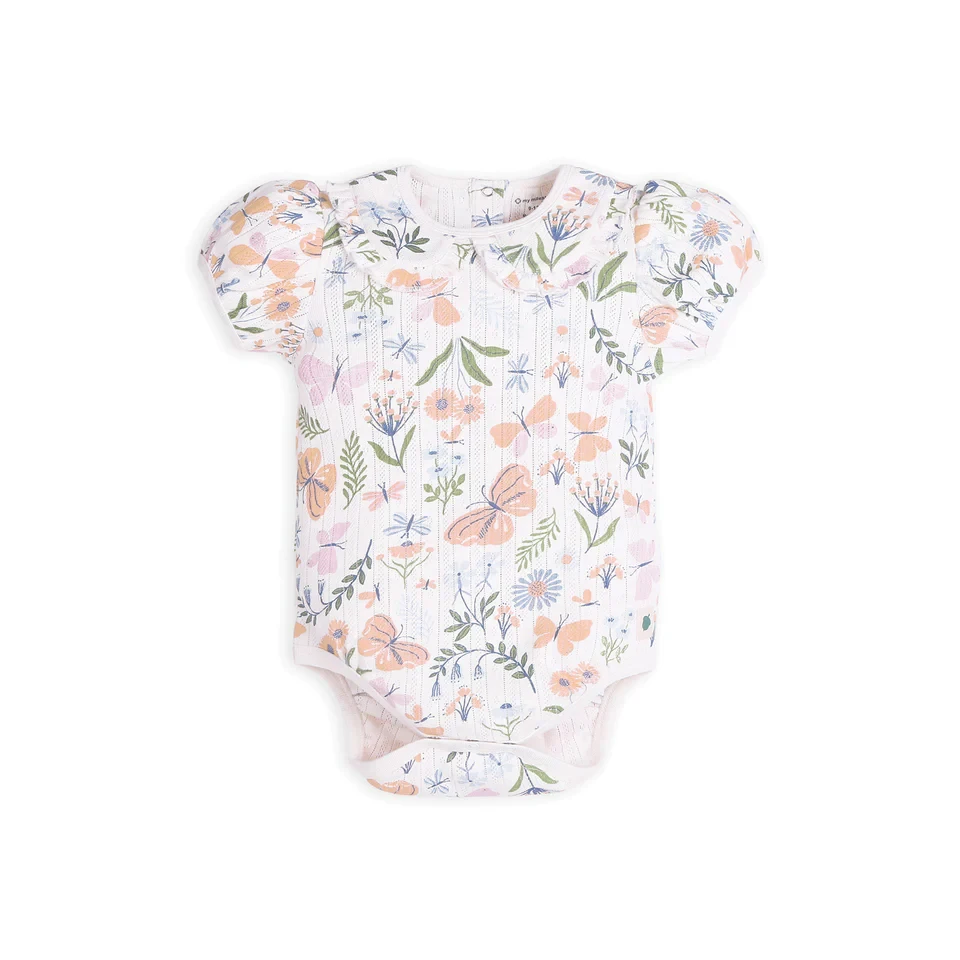 Our Enchanted Flora onesie, crafted from pure cotton pointelle knit, features a charming Peter Pan collar, delicate ruffle detailing, and snap buttons for easy dressing. Soft, breathable, and perfect for your little one’s everyday comfort and style.