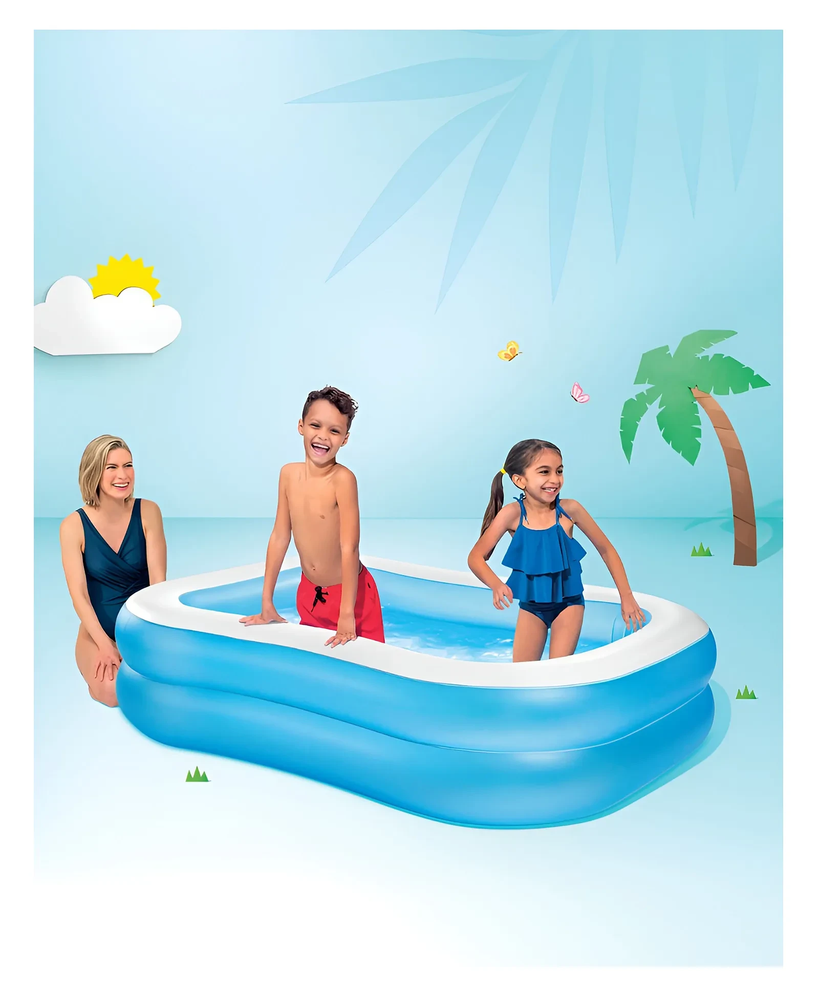Beatthe heat and enjoy endless water fun with the Intex 57180 Swim CenterInflatable Family Pool, designed for kids and adults to splash, play, and relaxin the comfort of their own backyard! Whether it's a fun pool party, coolingoff on a hot day, or a refreshing bath time experience, this spaciousinflatable pool is the perfect choice for family entertainment. Made fromhigh-quality, durable PVC material, this Intex swimming pool is built towithstand regular use while ensuring safety and comfort. The extra-widesidewalls provide superior support and stability, while the soft inflatablefloor offers a comfortable and secure play area for kids. The leak-proof andpuncture-resistant design ensures long-lasting enjoyment. With its generoussize, this family pool accommodates multiple people, making it great for groupfun, relaxing dips, or water games. The quick-inflate and deflate design allowsfor easy setup and storage, making it portable and convenient for home use,picnics, and vacations. Perfect for kids, teens, and adults, the Intex 57180Swim Center Inflatable Pool is a must-have for summer entertainment. Enjoyrefreshing water fun, relaxation, and quality family time with this amazingbackyard pool!