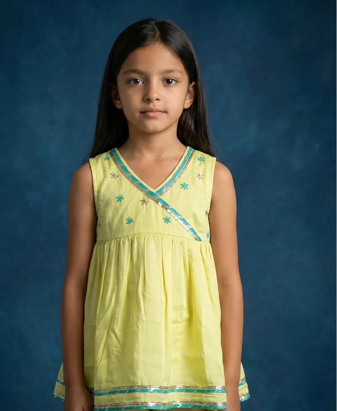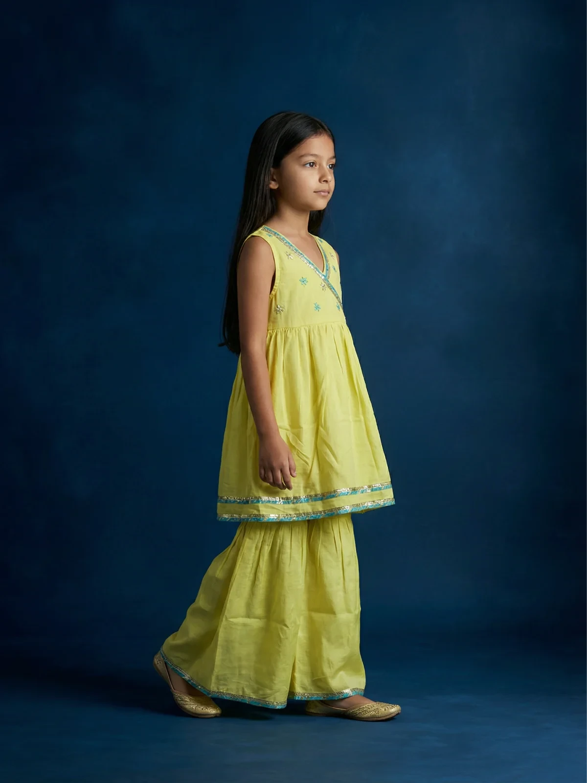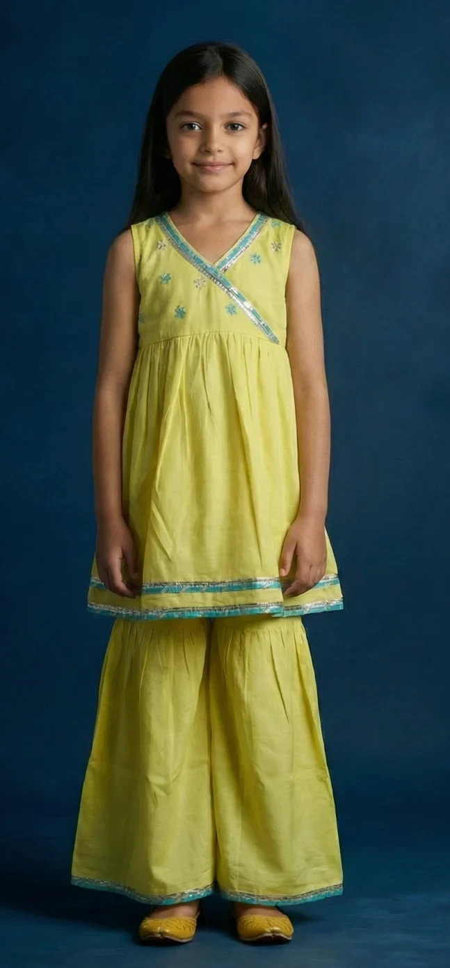 1. Girls kurta and sharara set in santoon fabric.