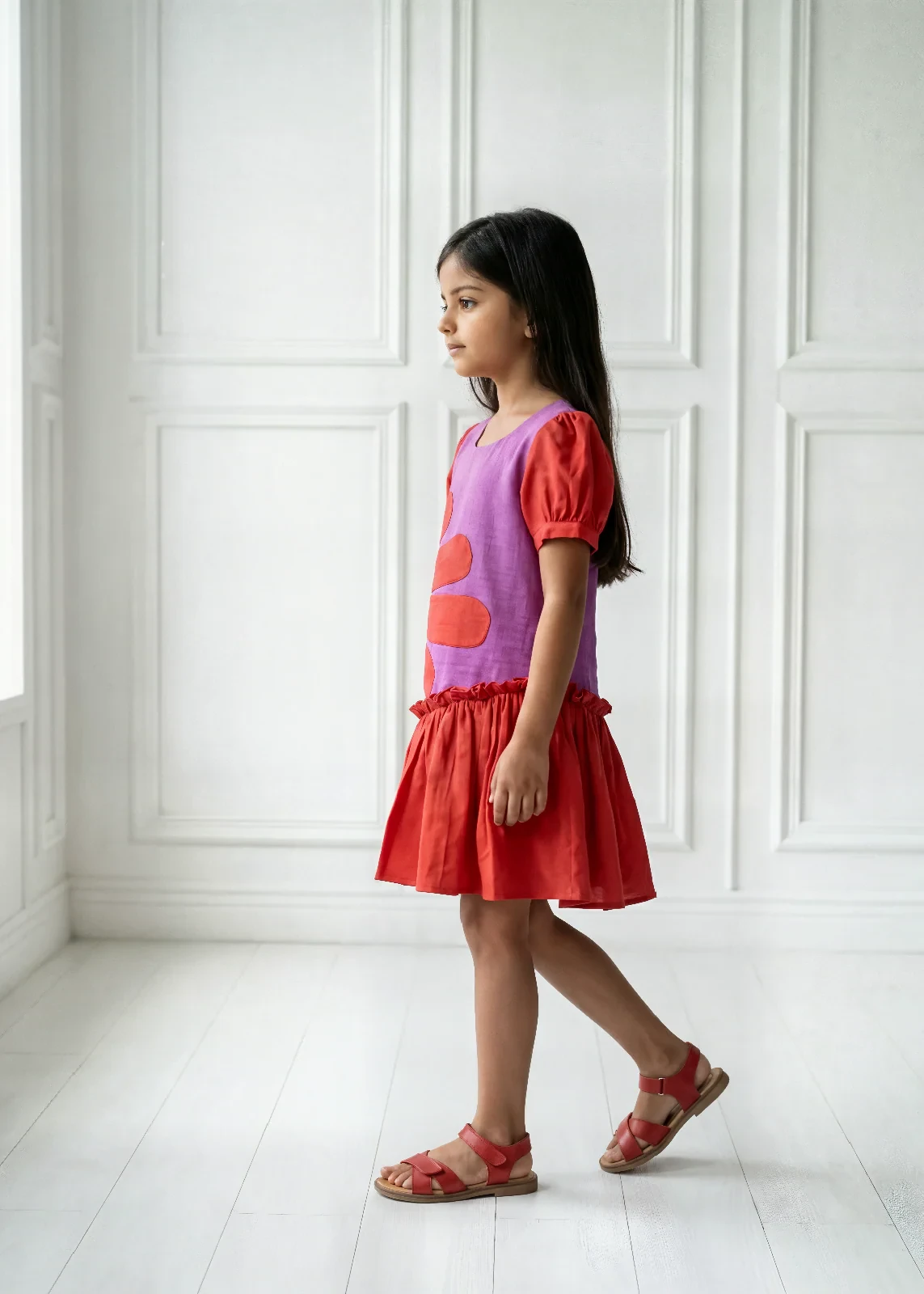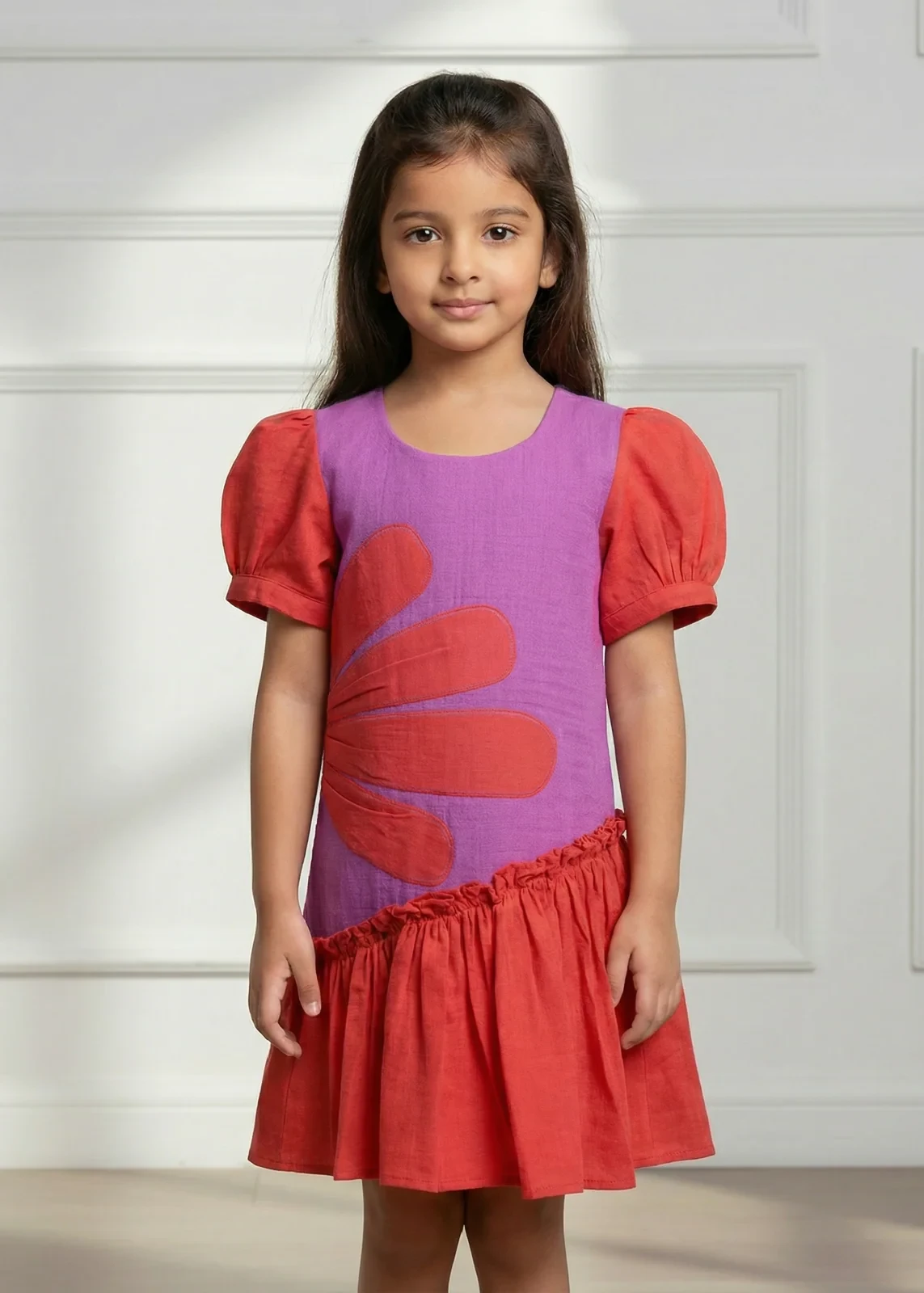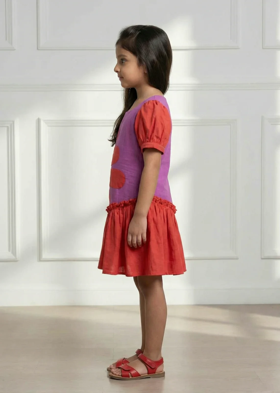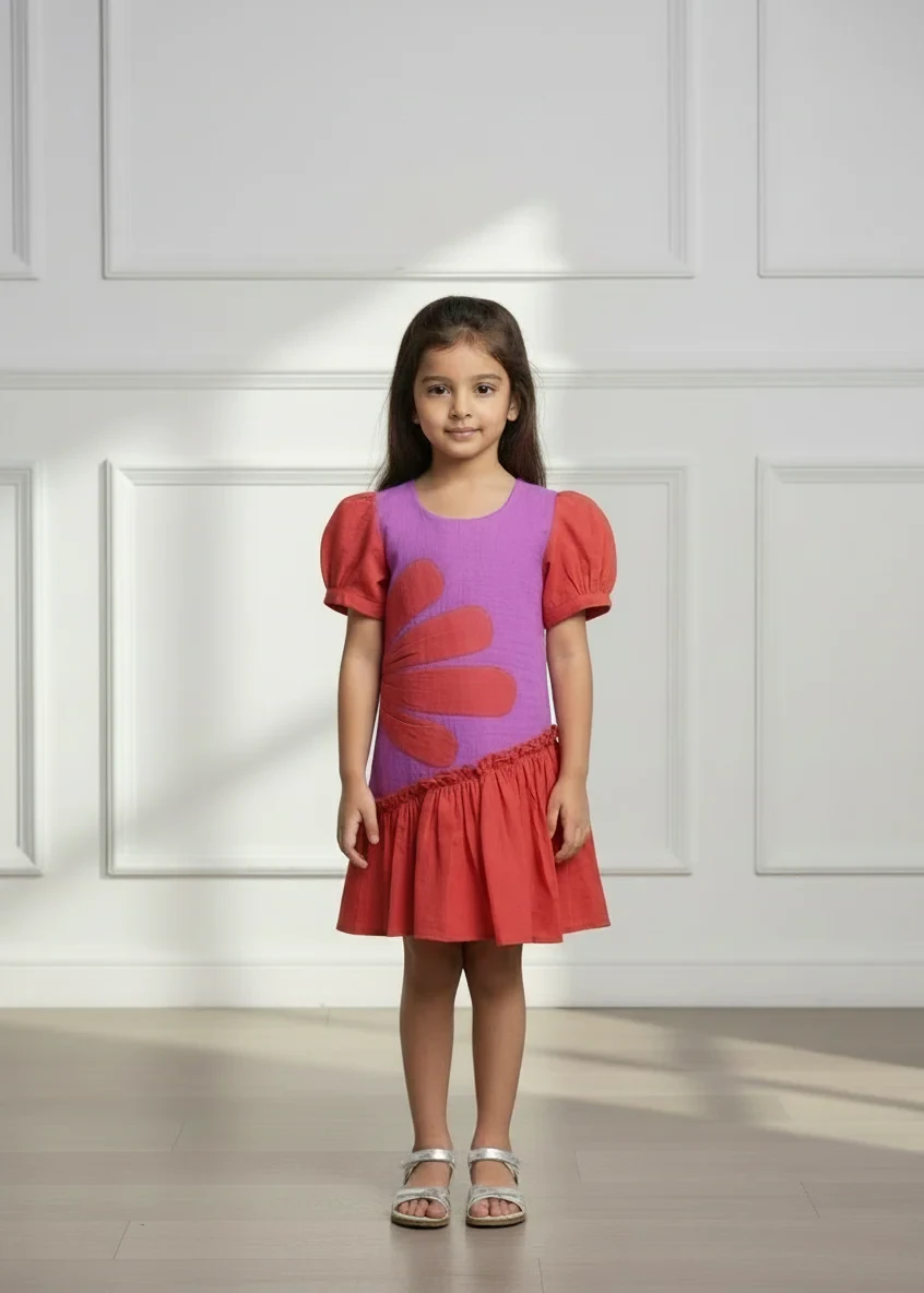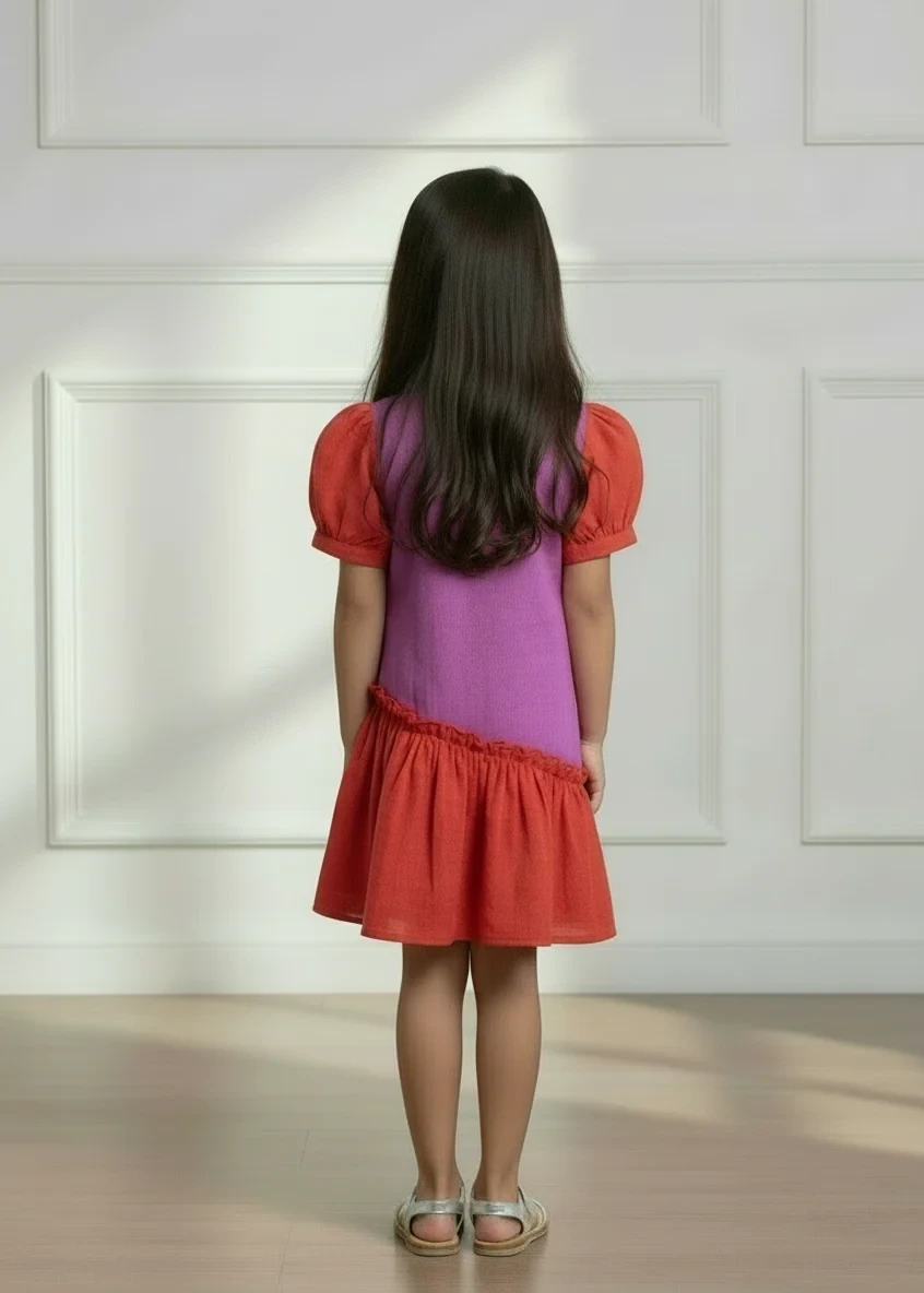 1. Two-tone cotton gauze frock in red and pink with puff sleeves and an exposed asymmetric red hemline.