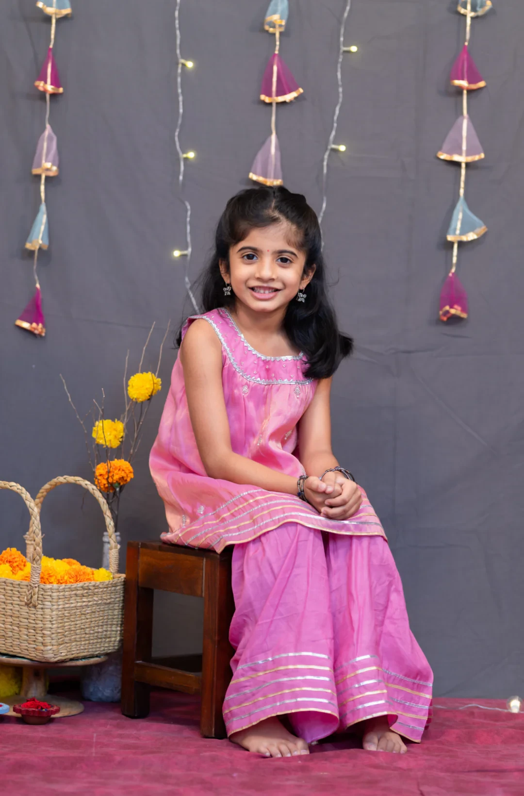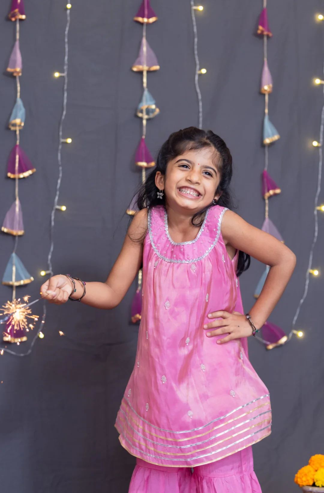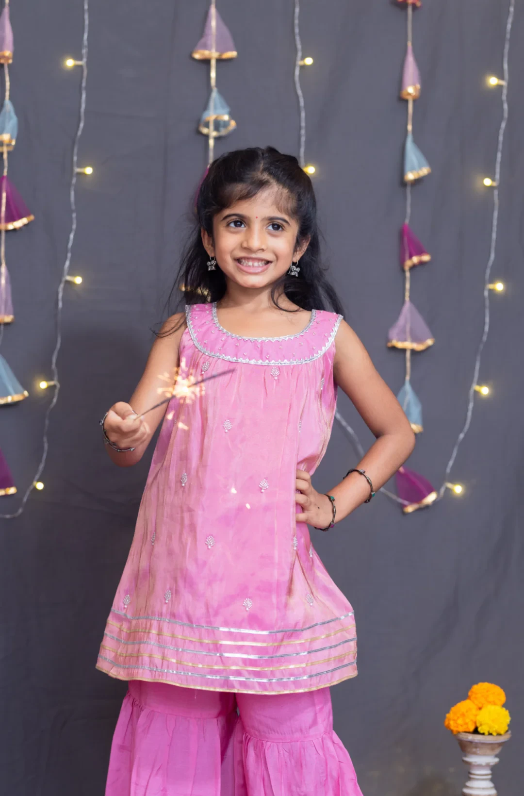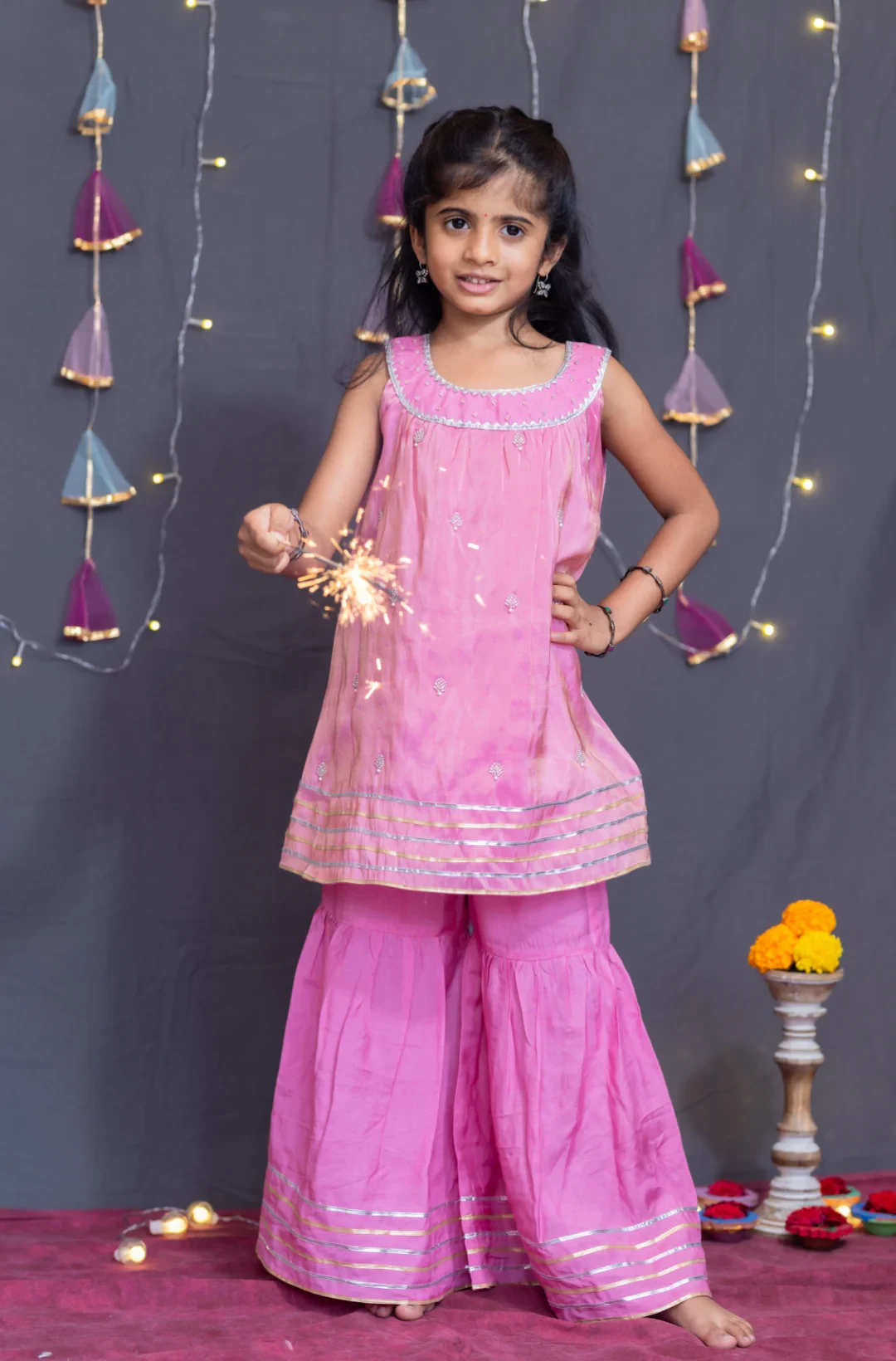 2. Coordinated Sharara: Matching pink sharara with an elasticated waist and gota lace detailing for a seamless, festive look.