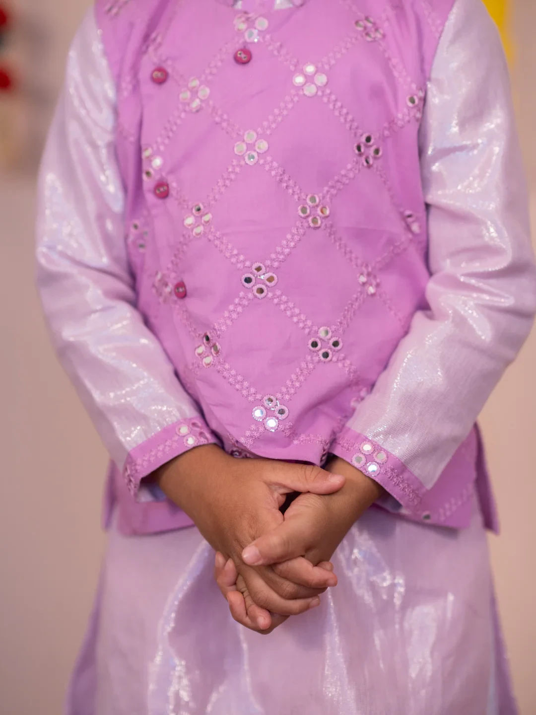 3. Mirror Work Bundi Jacket: Lilac bundi with all-over mirror work, mandarin collar, and cotton lining for a regal, festive look.