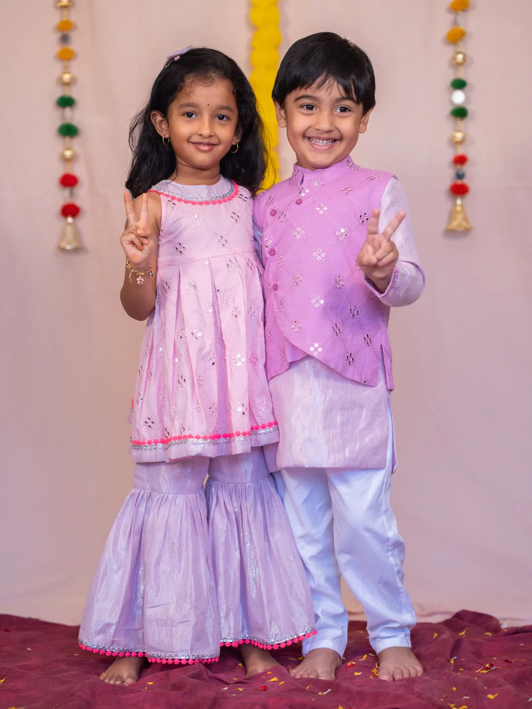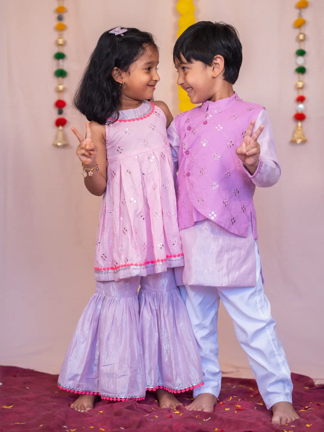 1. Pre-order Indian Wear: Elegant lilac kurta, pants, and mirror work bundi set – a perfect festive ensemble.