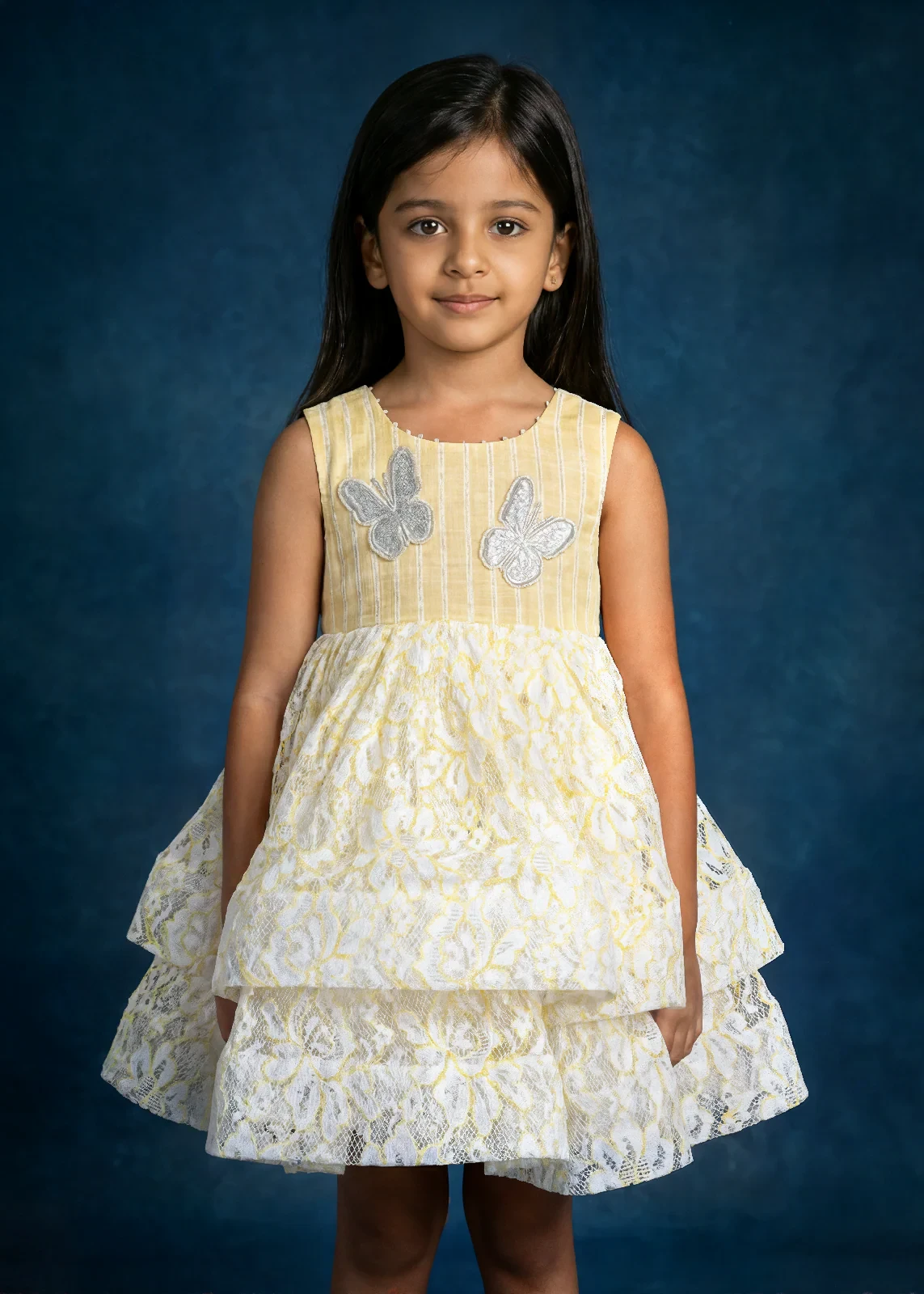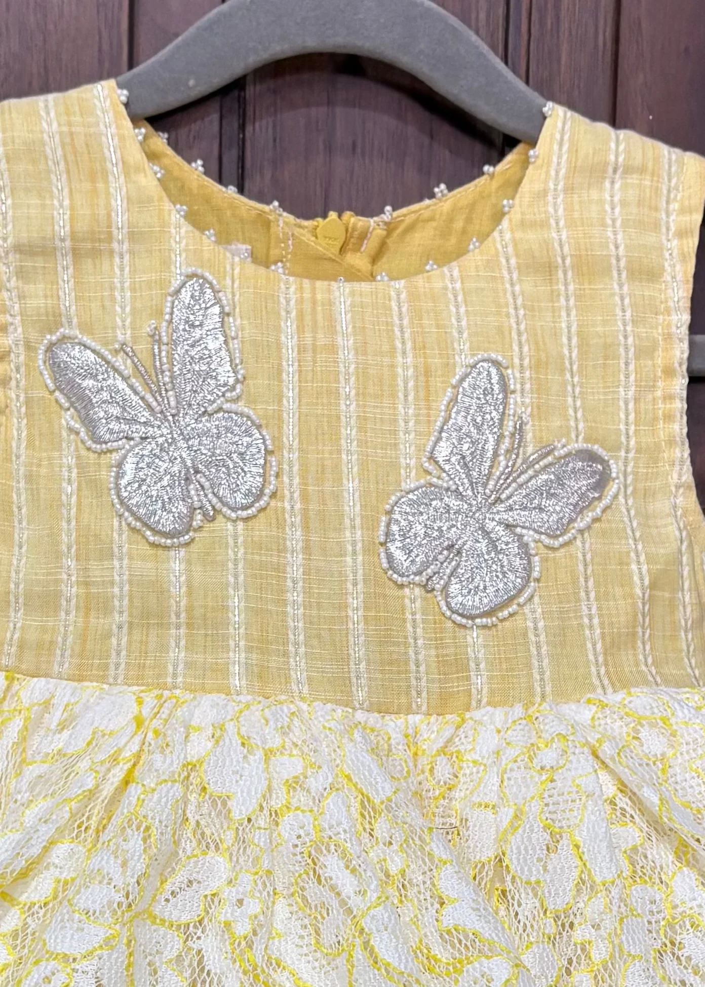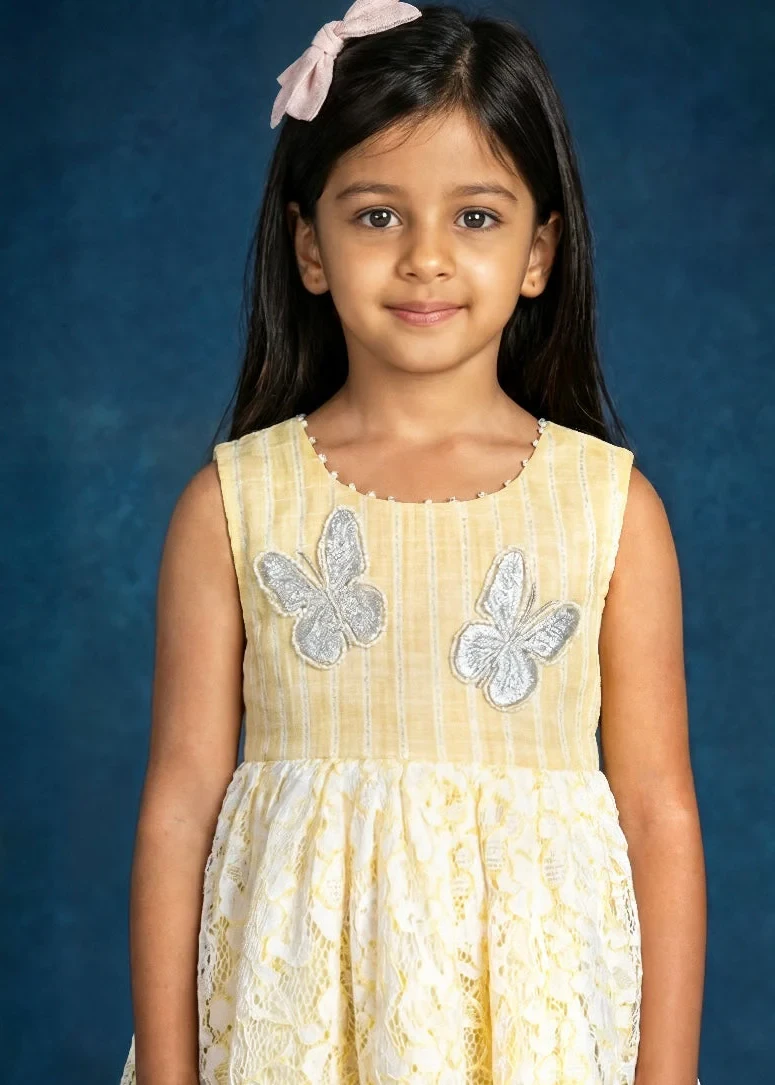 1. Perfect party frock for little girls. The yellow lurex cotton yoke is adorned with silver butterfly motifs and delicate pearl handwork, with a pearl-embellished neckline for added elegance.