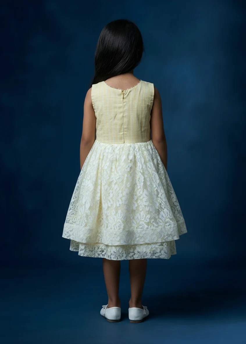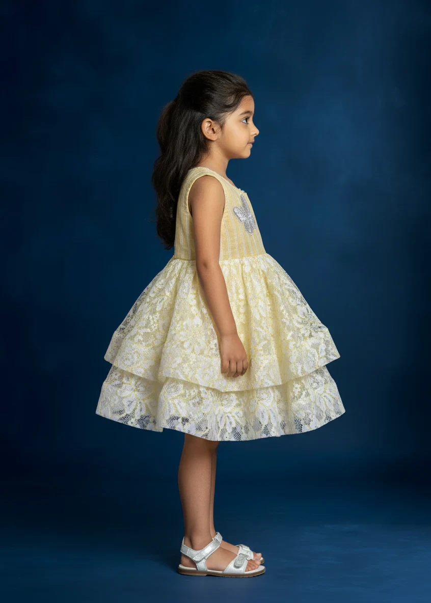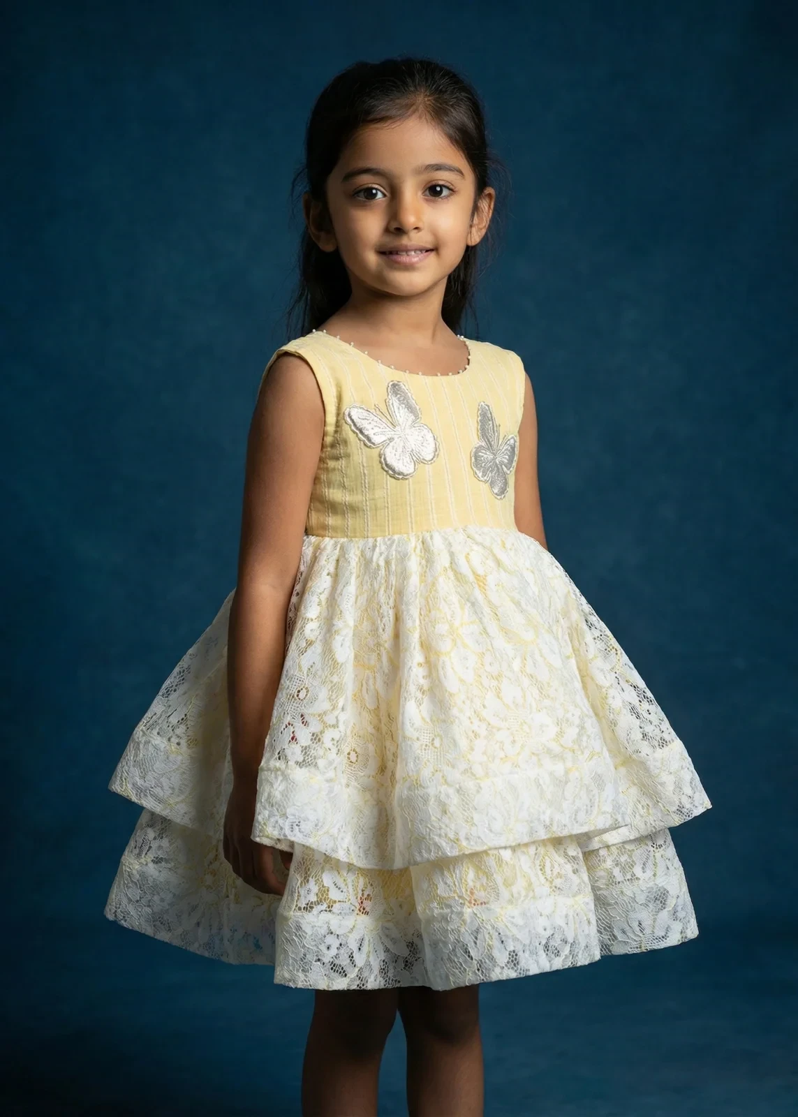 1. Perfect party frock for little girls. The yellow lurex cotton yoke is adorned with silver butterfly motifs and delicate pearl handwork, with a pearl-embellished neckline for added elegance.