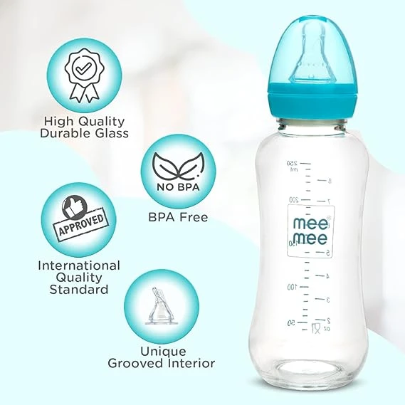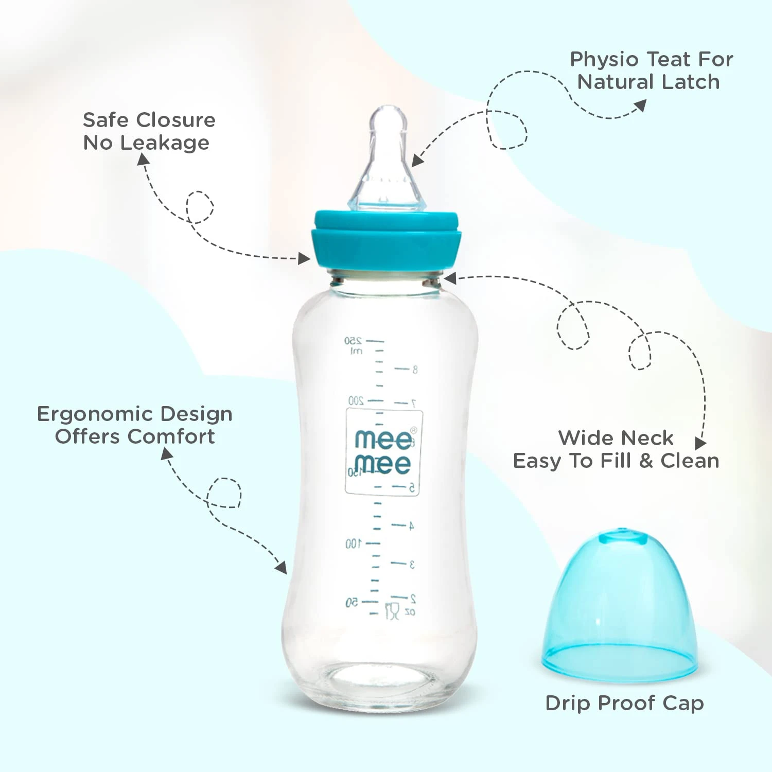 Mee Mee Glass Feeding Bottle 240ml| Eazy Flo Technology, Anti-Colic Valve, Anti-Slip Ergonomic Shape & Slim Neck | BPA-Free, Borosilicate Glass Feeding Bottle for 0m+/Babies Upto 3 Years (Blue)Mee Mee Glass Feeding Bottle 240ml| Eazy Flo Technology, Anti-Colic Valve, Anti-Slip Ergonomic Shape & Slim Neck | BPA-Free, Borosilicate Glass Feeding Bottle for 0m+/Babies Upto 3 Years (Blue)