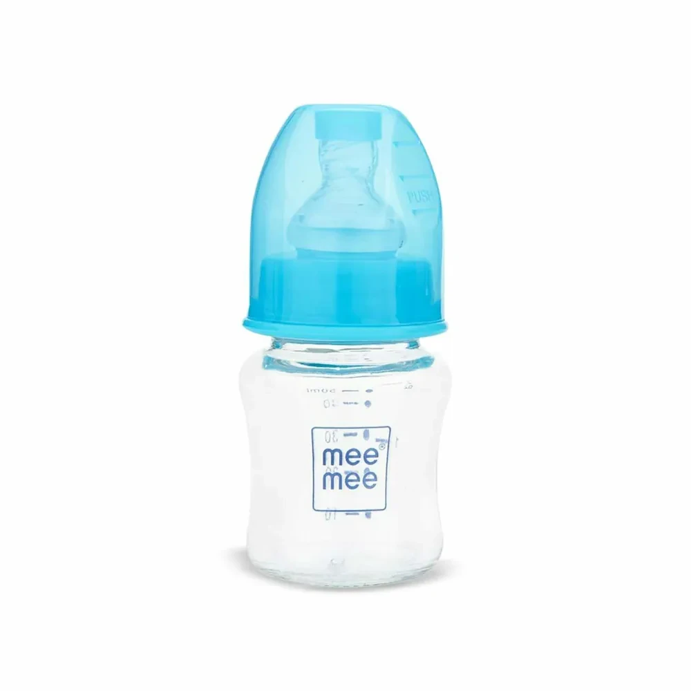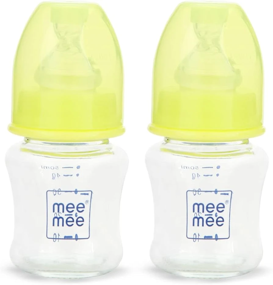 Mee Mee Glass Feeding Bottle 50ml| Eazy Flo Technology, Anti-Colic Valve, Anti-Slip Ergonomic Shape & Slim Neck | BPA-Free, Borosilicate Glass Feeding Bottle for 0m+/Babies Upto 3 Years
