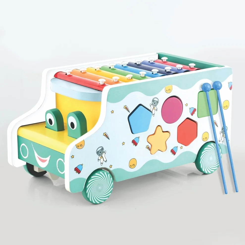 This wooden activity bus features an 8-note xylophone for musical exploration, a sliding maze game to build problem-solving skills, a shape sorter to improve hand-eye coordination, dancing eyes that spark curiosity, smooth-running wheels for active play, and a built-in storage compartment for added convenience. Each activity supports the development of fine motor skills, logical thinking, color recognition, and sensory exploration.