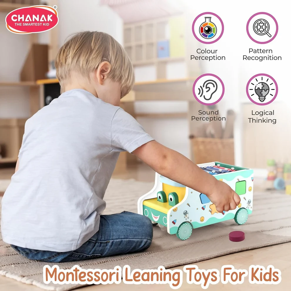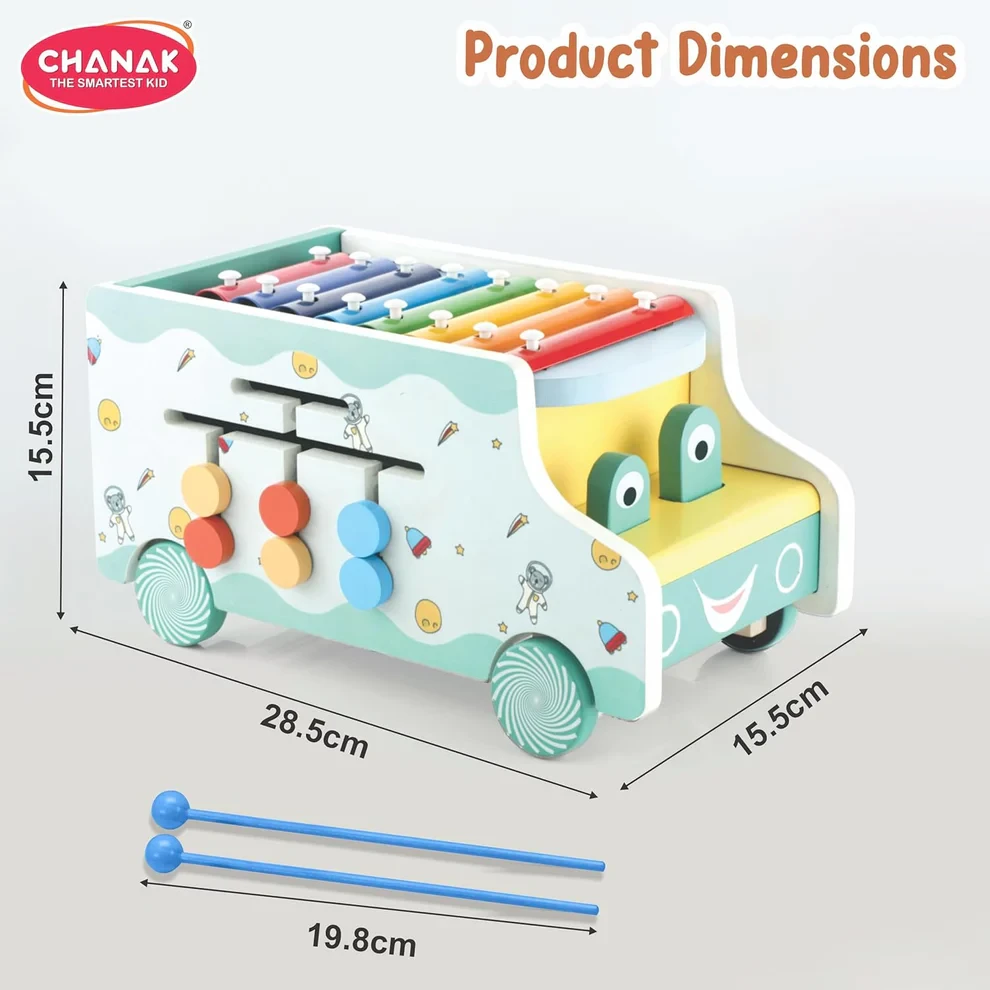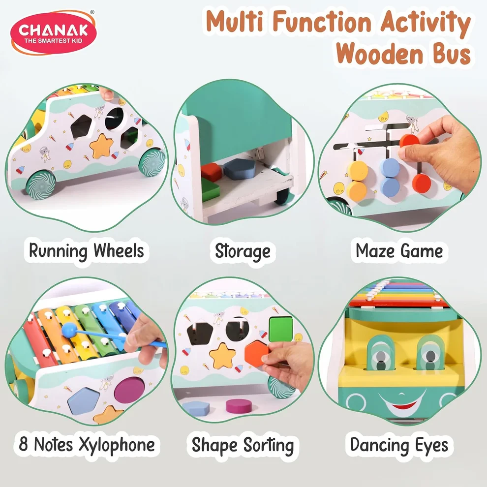 Chanak Wooden Activity Bus 6-in-1 Montessori Toys Truck Multifunctional Early Educational Musical Miles Includes Shape Sorter, Xylophone, Maze, Storage, Dancing Eyes Bus For Boys Girls, Above 3+ Age