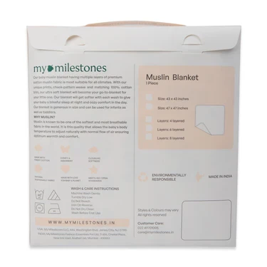 My Milestones Muslin Baby Blanket with 4 layers of premium 100% cotton Muslin fabric is most suitable for moderate climates. Our ultra-soft blanket will become your go-to blanket for your little one. Our blanket will get softer with each wash to give your baby a blissful sleep at night and cozy comfort during the day.