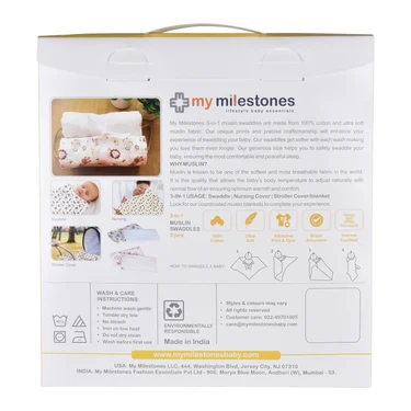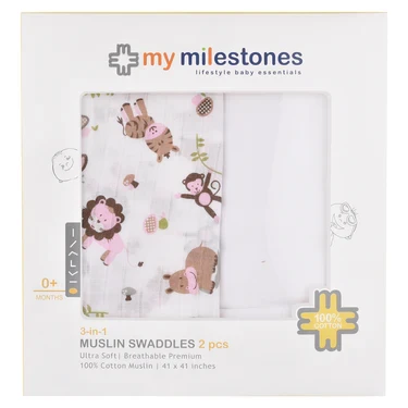 My Milestones 3-in-1 Muslin Swaddles are made from premium 100% cotton, ultra soft muslin fabric. Our unique attractive Zoo prints and precise craftsmanship will enhance your experience of swaddling your baby. Our swaddles will get softer with each wash to ensure that you and your baby will continue to love them. The generous size allows you to safely swaddle your baby ensuring the most comfortable and peaceful sleep.
