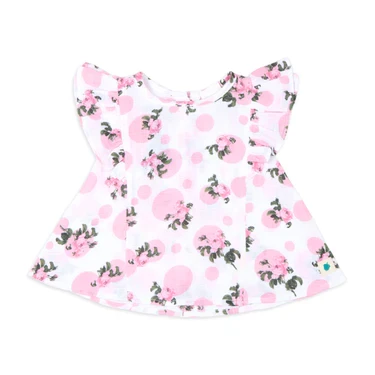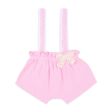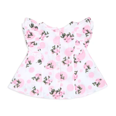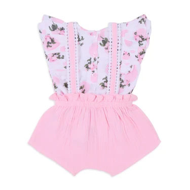 Our Tea Rose muslin top with a soft tea rose print and ruffle details, paired with pink double cloth lace-detail suspender shorts, creates a charming and stylish outfit. The soft elastication at the hemline with ruffles ensures a perfect, comfortable fit, making this set both elegant and practical for your little one.