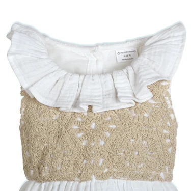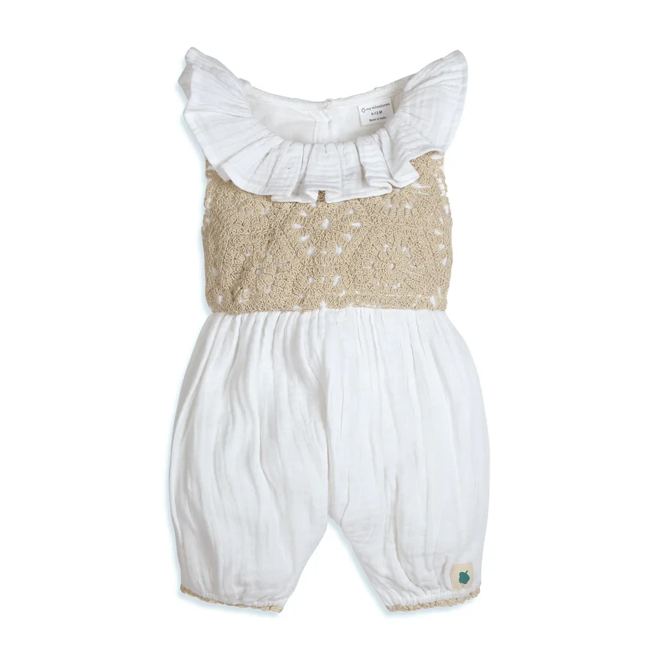 The Fawn Crochet Double Cloth Romper in white is a charming and comfortable piece for your little one. Crafted from soft double cloth fabric, it ensures a breathable and gentle fit. The romper features delicate crochet detailing and playful ruffle accents, adding a touch of elegance and whimsy.