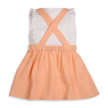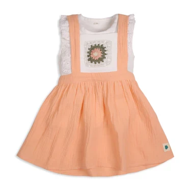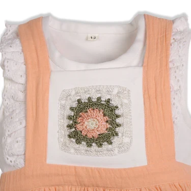 The combination of the dungaree style and delicate crochet work adds a special touch, perfect for both casual and semi-formal occasions. Paired with a white knit tee featuring eyelet ruffle details, this outfit offers added texture and style. The soft fabric and thoughtful design ensure comfort and practicality, making it an ideal choice for your little one.