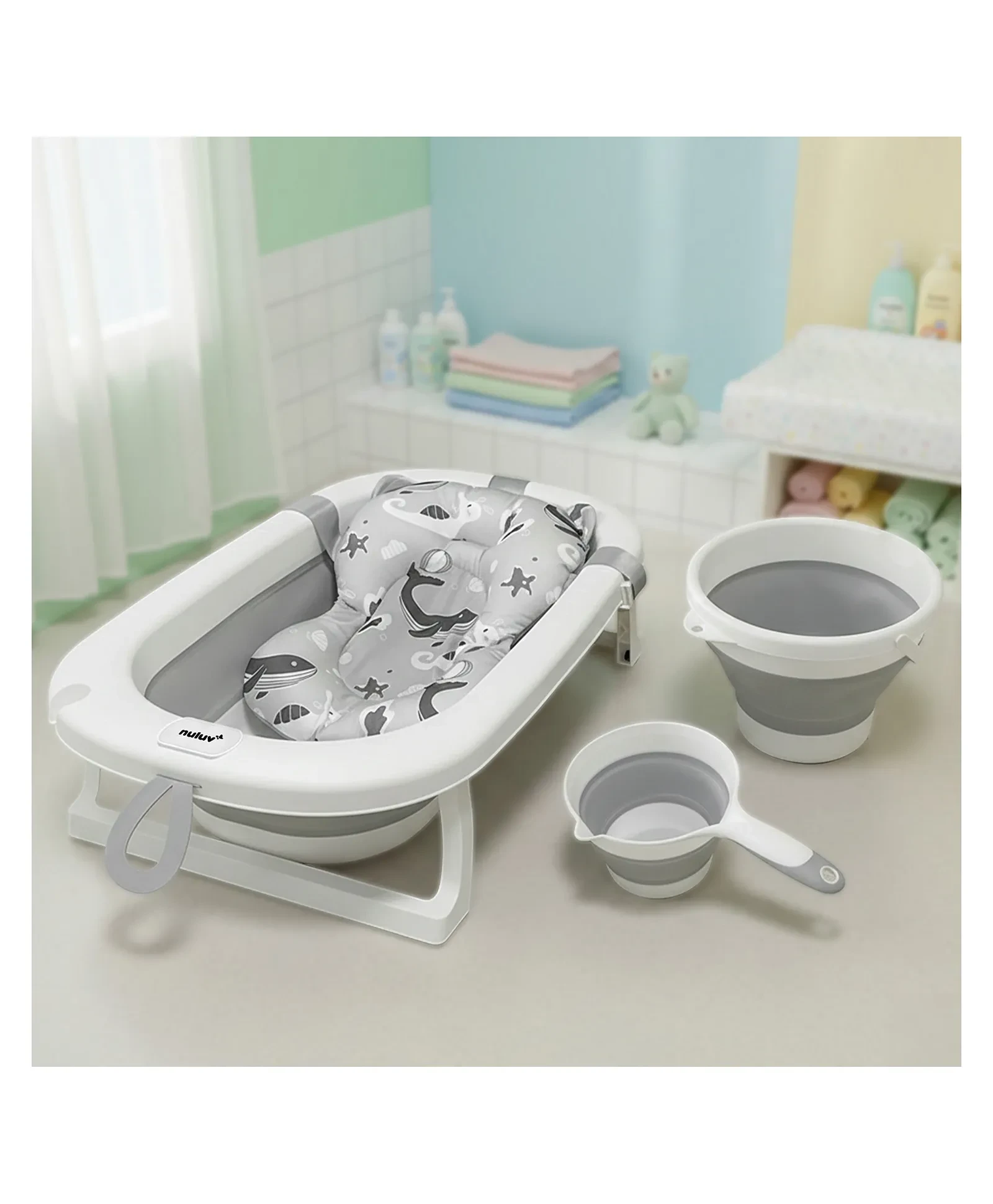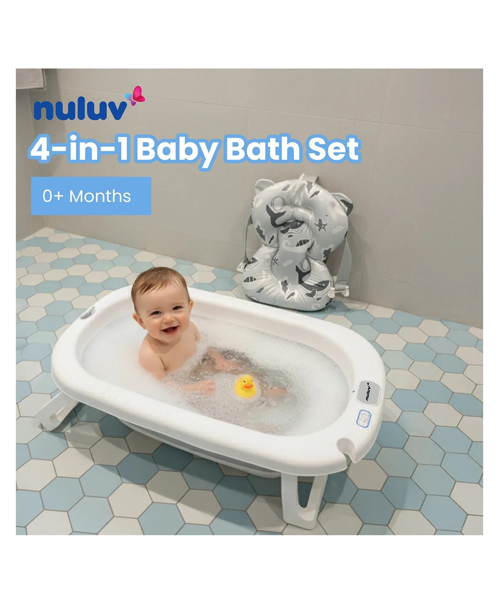 Nuluv 4-in-1 Baby Bath Set, Foldable Baby Bathtub with Bath Sling, Bucket and Rinser, Mildew-Proof, Non-Slip Base, Safe and Sturdy Material, Compact, Easy Fold Design, For Babies 0+ Months