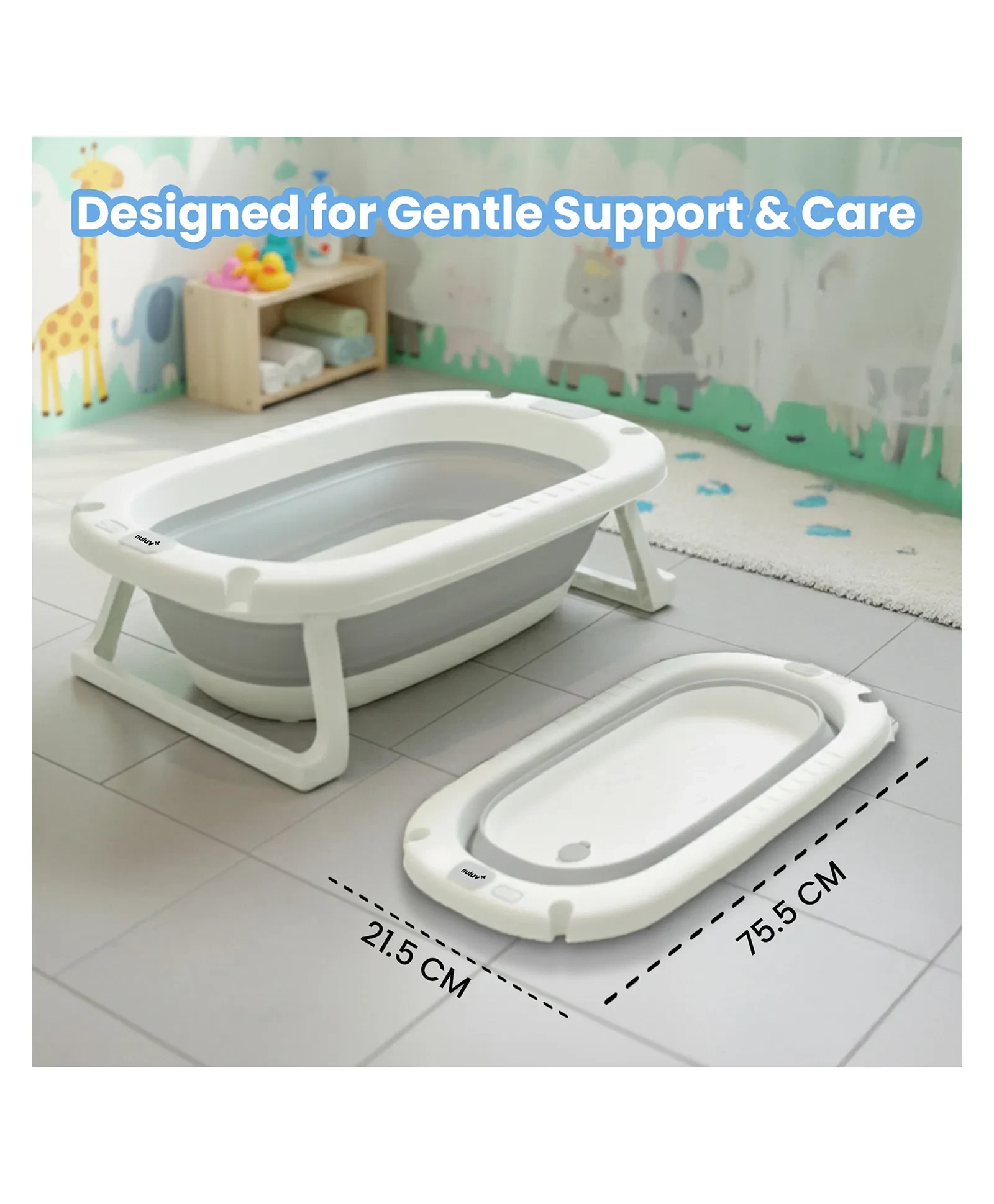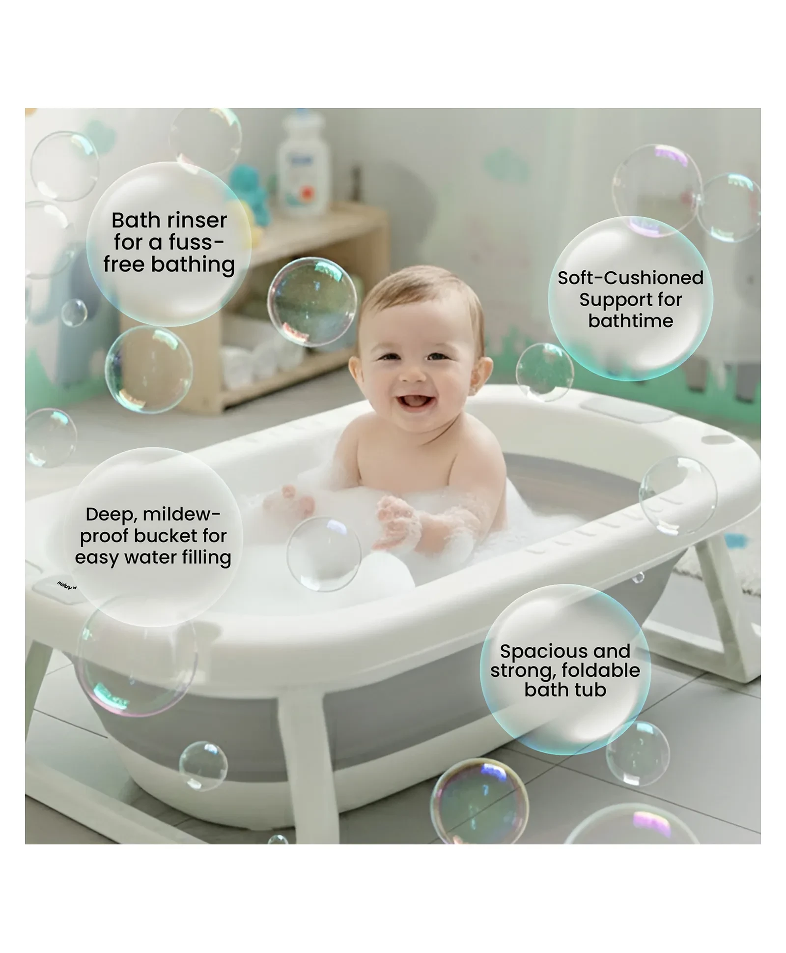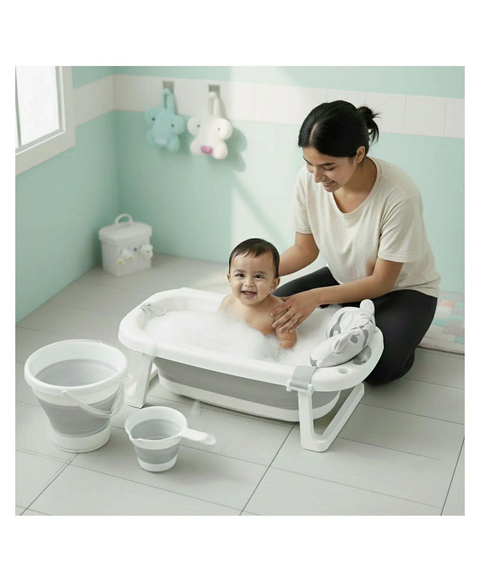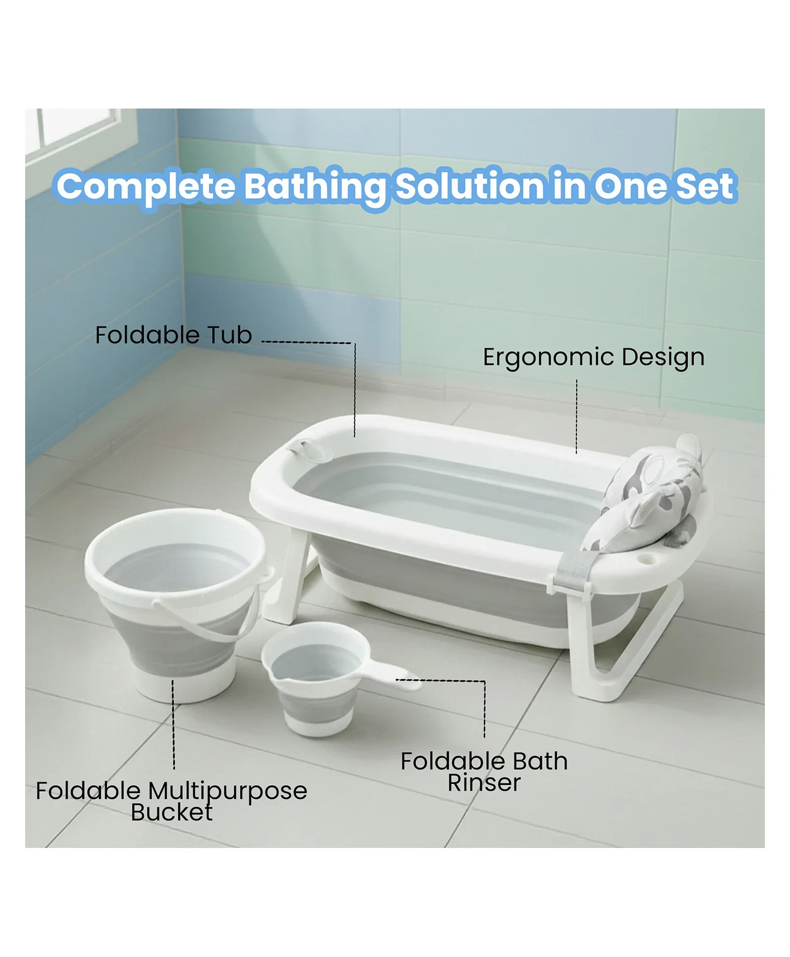 1. 4-IN-1 COMPLETE BABY BATH SET This all-in-one bath set includes a foldable baby bathtub, soft bath sling, foldable bucket, and a foldable rinser, for a smooth and comfortable bath time.