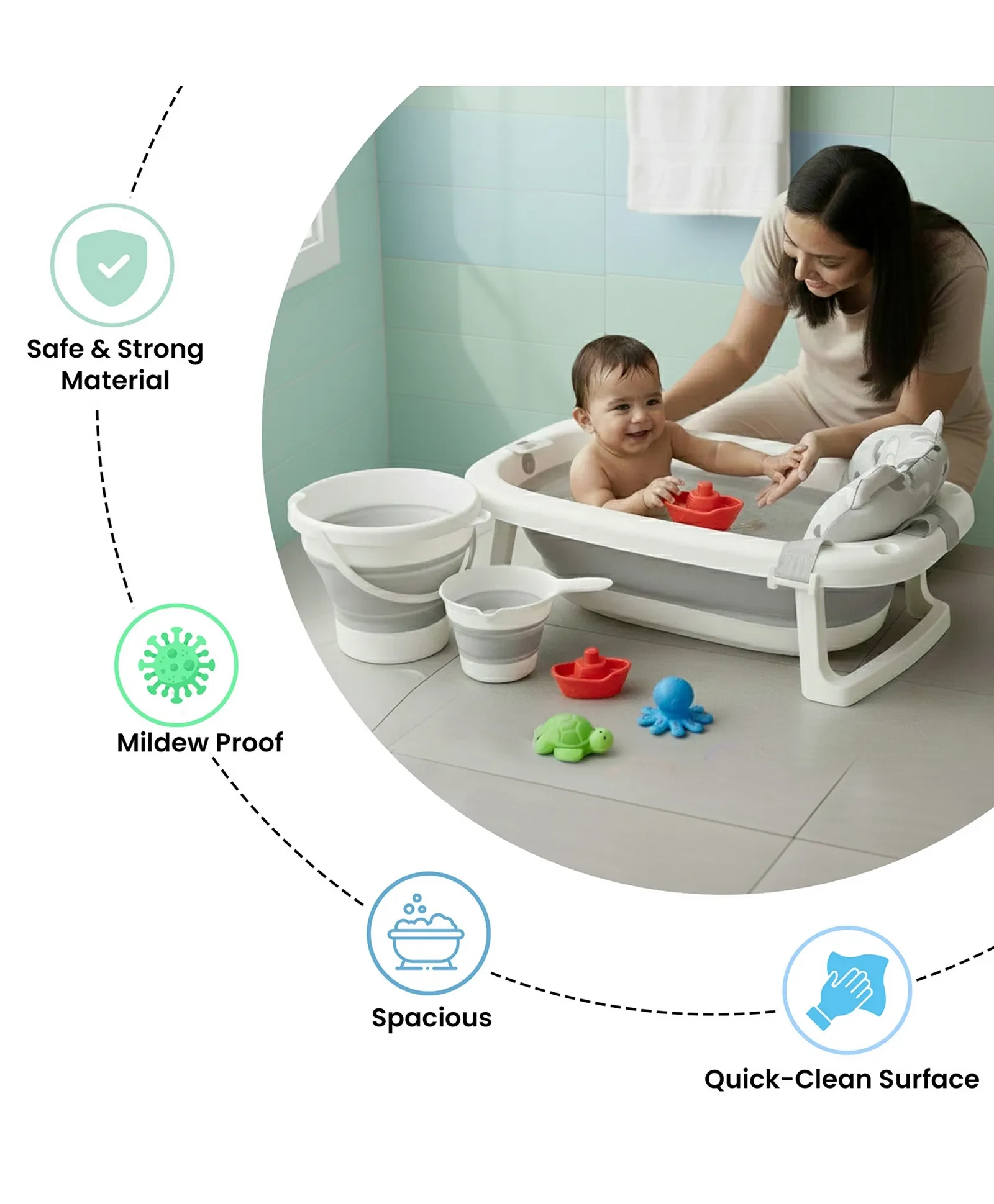 2. SAFE, STURDY AND MILDEW-PROOF MATERIALS Crafted from high-quality, durable, mildew-proof materials that ensure long-lasting use. Designed for daily bathing with full safety and hygiene in mind.