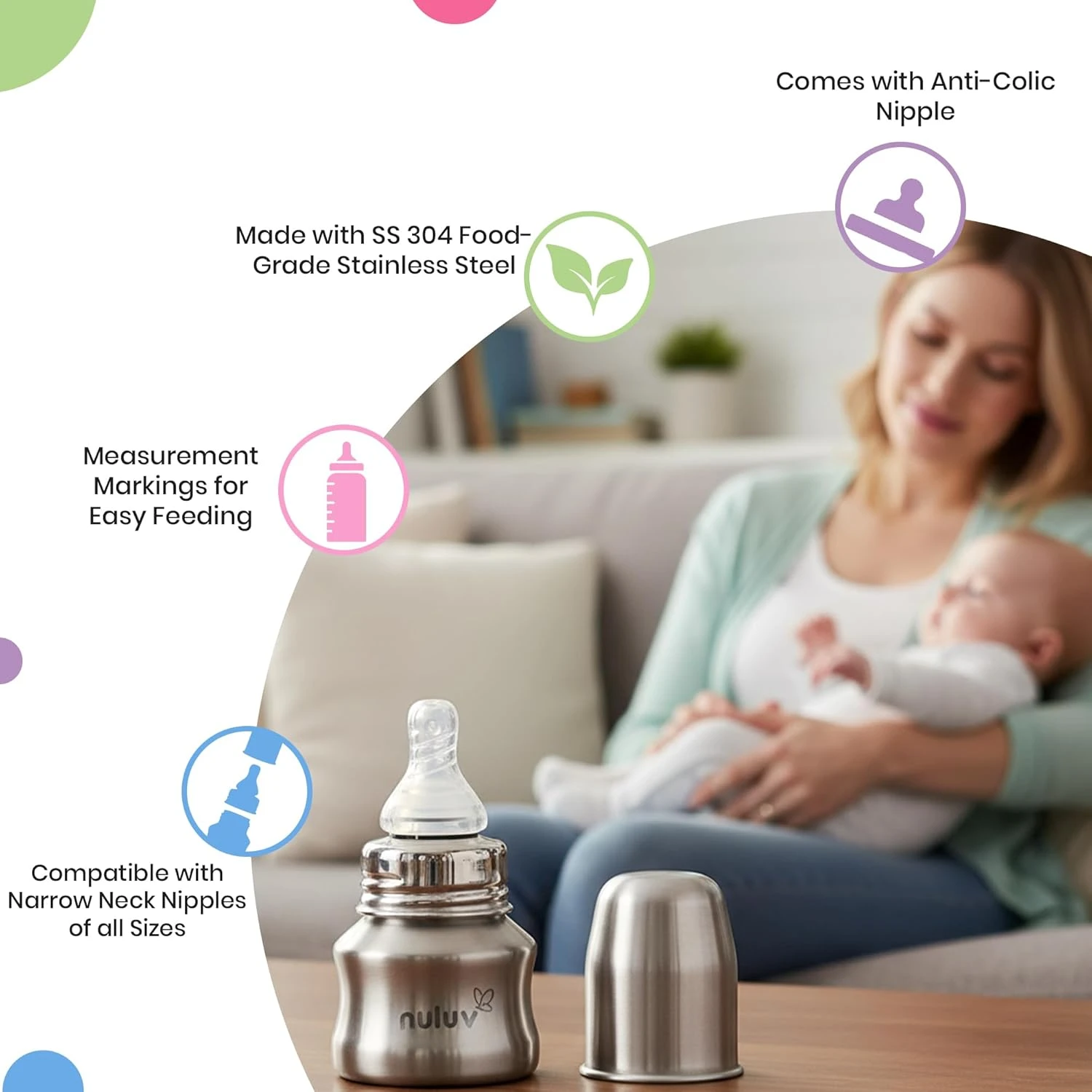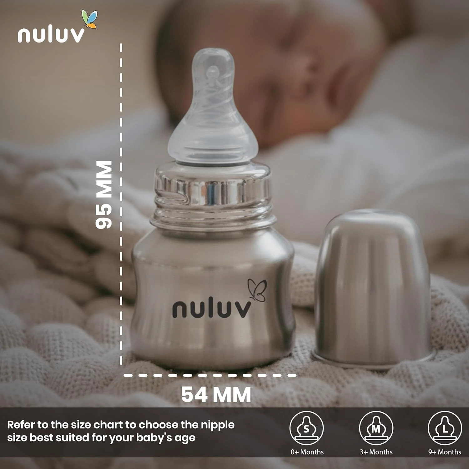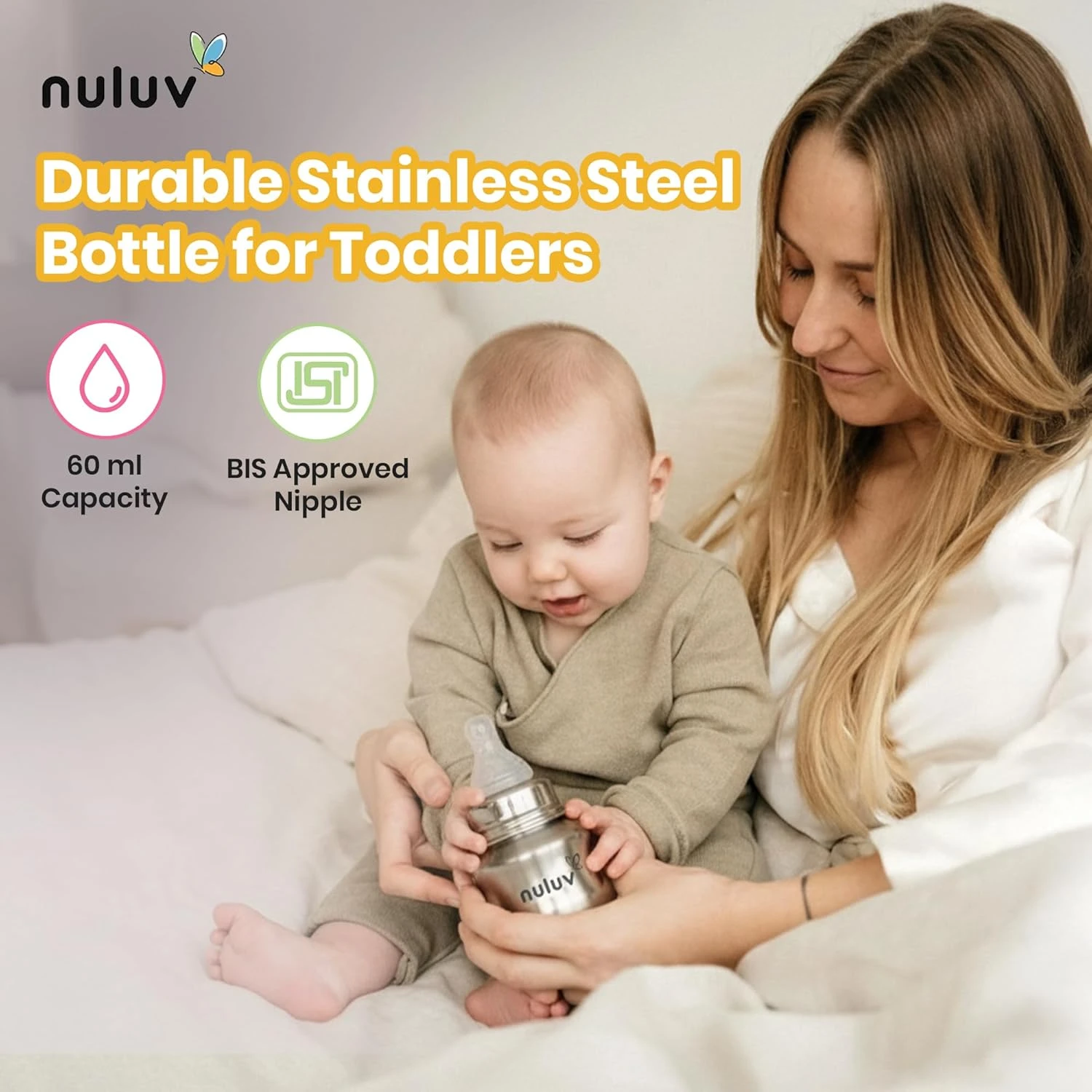 NULUV Nourish+ Stainless Steel Feeding Bottle 60ml with L Size Nipple, 9 + Months Babies, Food Grade SS 304, Anti-Colic Silicone Nipple, BPA Free, Baby Bottle, Easy to Clean, BIS Certified