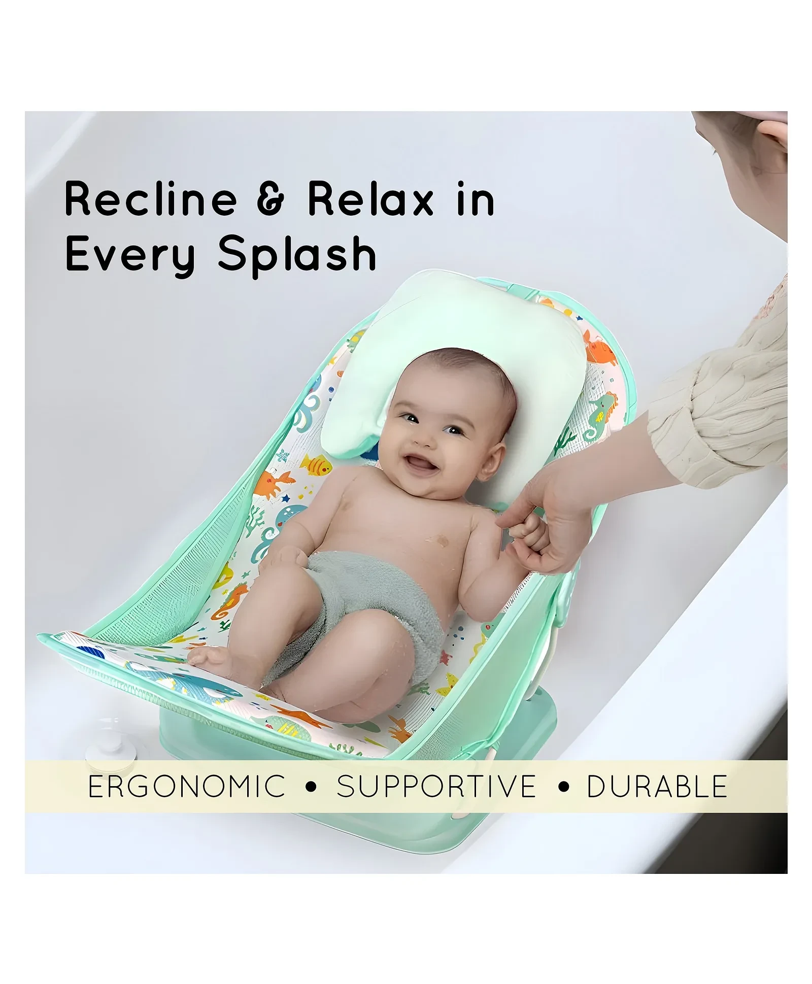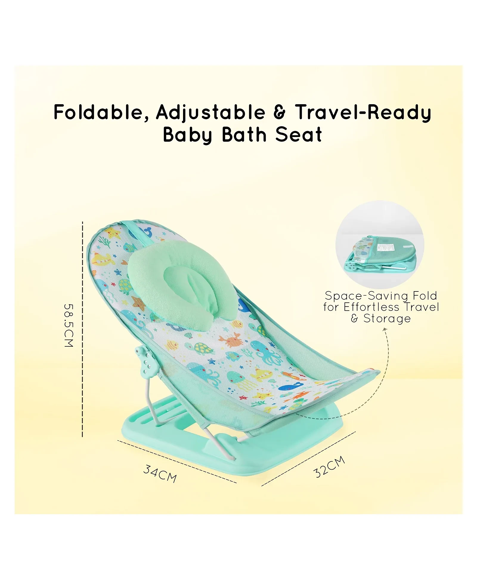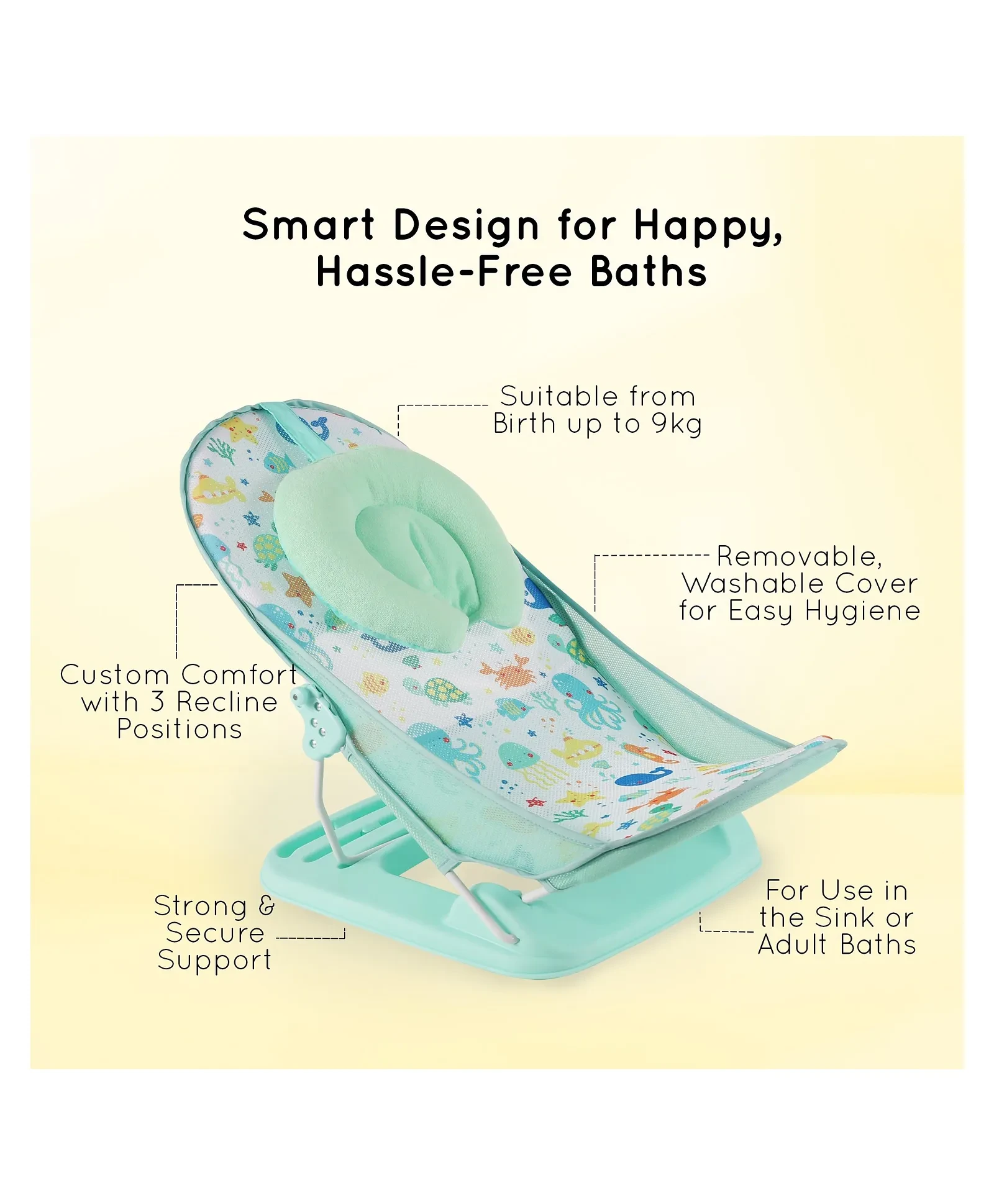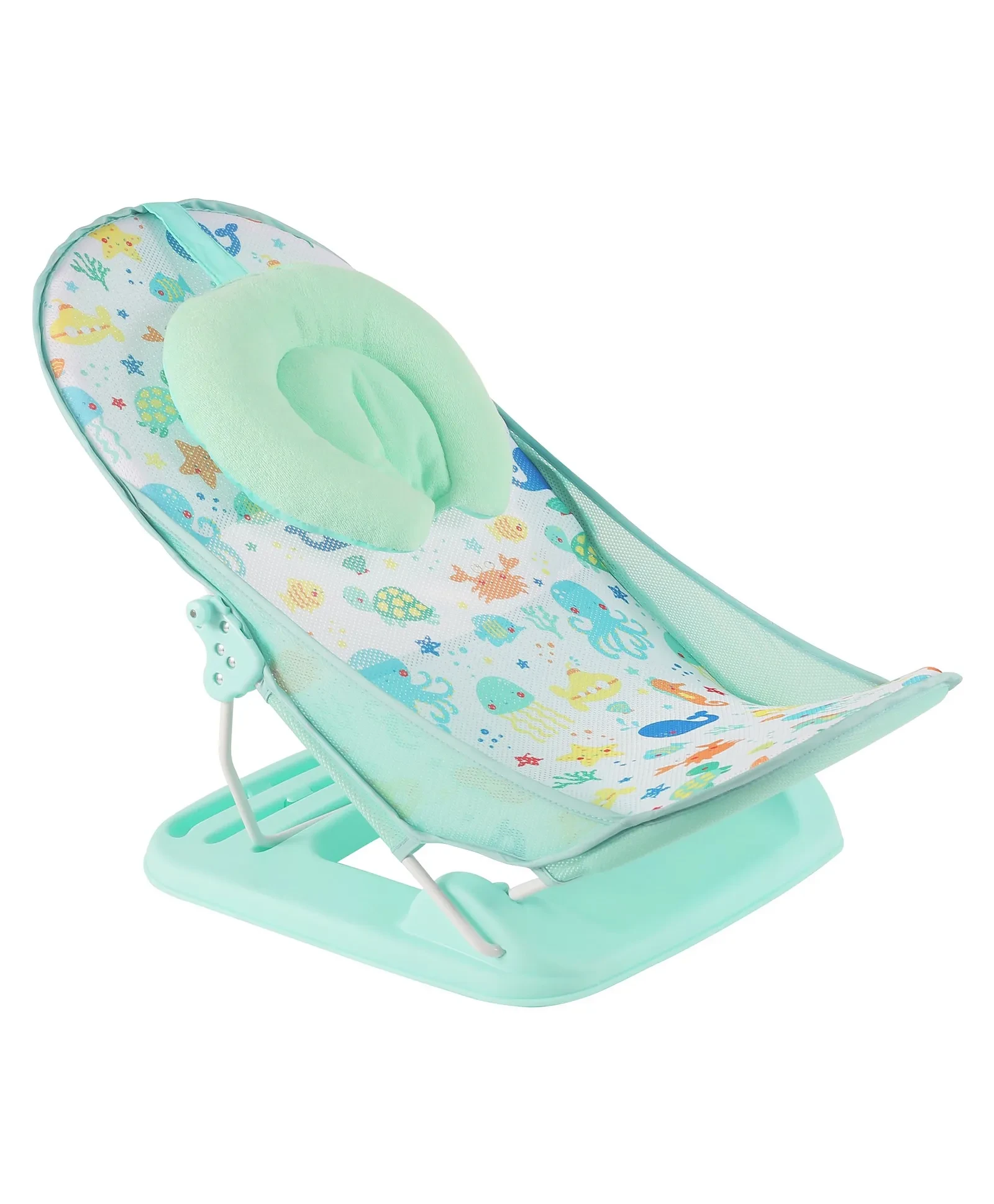 Foldable & Adjustable Home & Travel Baby Bath Bather Seat. Suitablefrom birth, can be used upto when your child can sit unaided. Maximum weightlimit 5 kg.. 3-Position Recline for child's comfort for use in the sink or adultbathtub. Soft and breathable fabric used. Compact Fold for storage & Traveler movable,machine washable Fabric Heads support (optional).