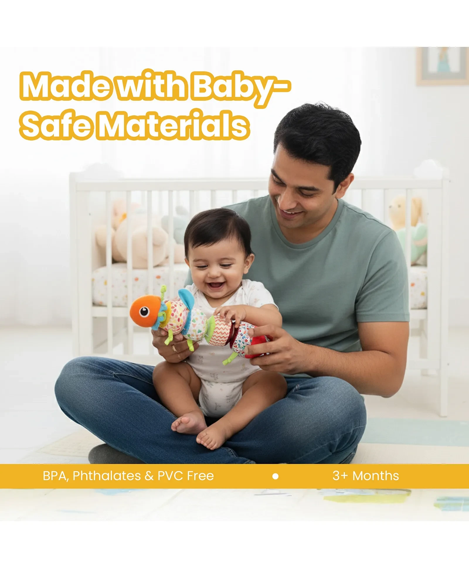 The ActivitySnail Rattle Toy is a playful and interactive toy for babies. Featuring agentle rattle sound and soft textures, it helps stimulate sensory development. Thesnail has 8 soft body sections that are easy to move and play with. Eachsection has Velcro so you can separate them and put them back together. BigEyes and Smiley Face.