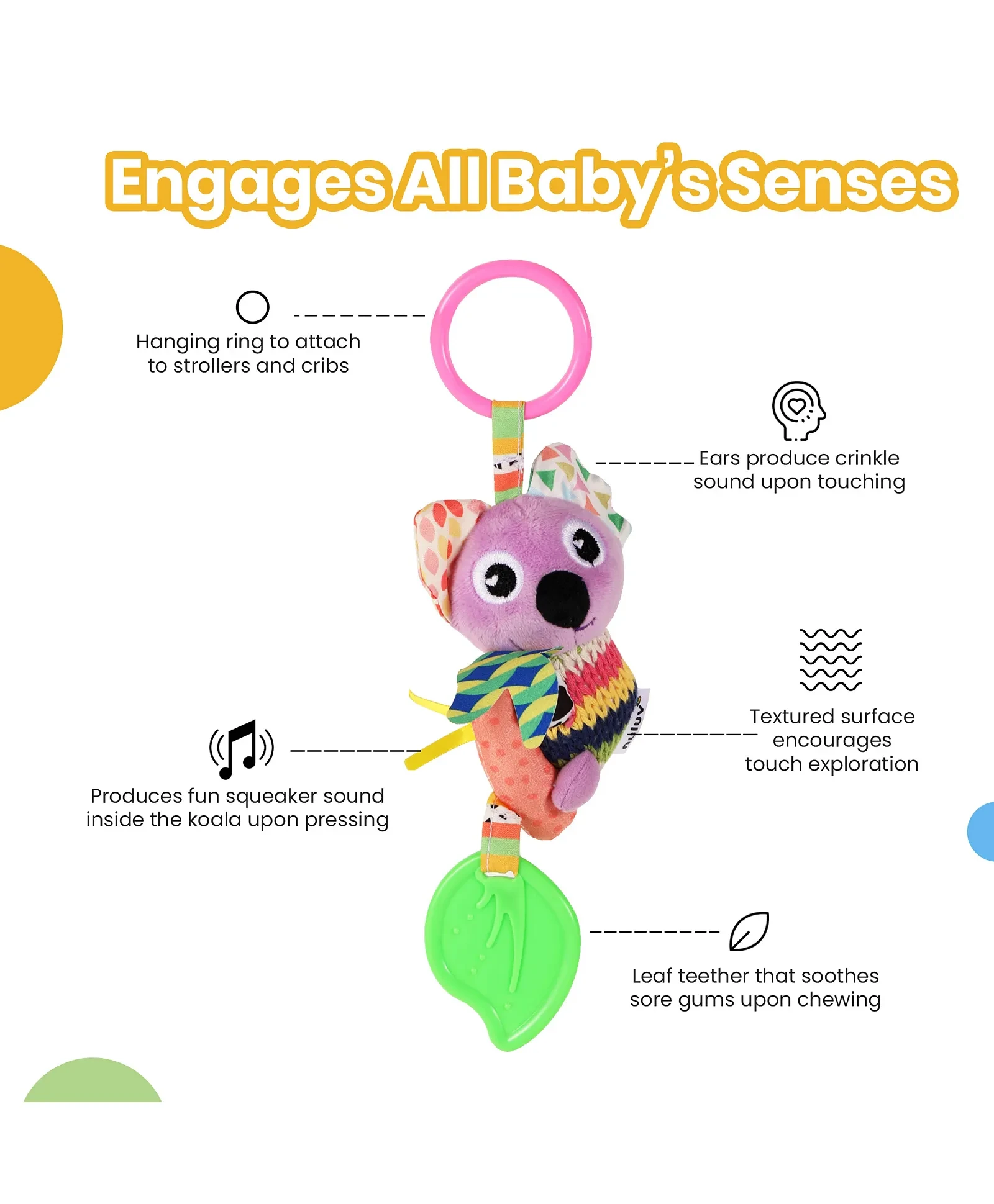 The ActivityKoala Toy is a soft and fun toy with different textures, a rattle inside, and ahanging ring. It's perfect for babies to explore and enjoy during playtime! withqueaker, teether, crinkle fabric that makes a fun sound when touched, adding anextra layer of sensory play. Safe and Cuddly Infant Toy for 3+ Months
