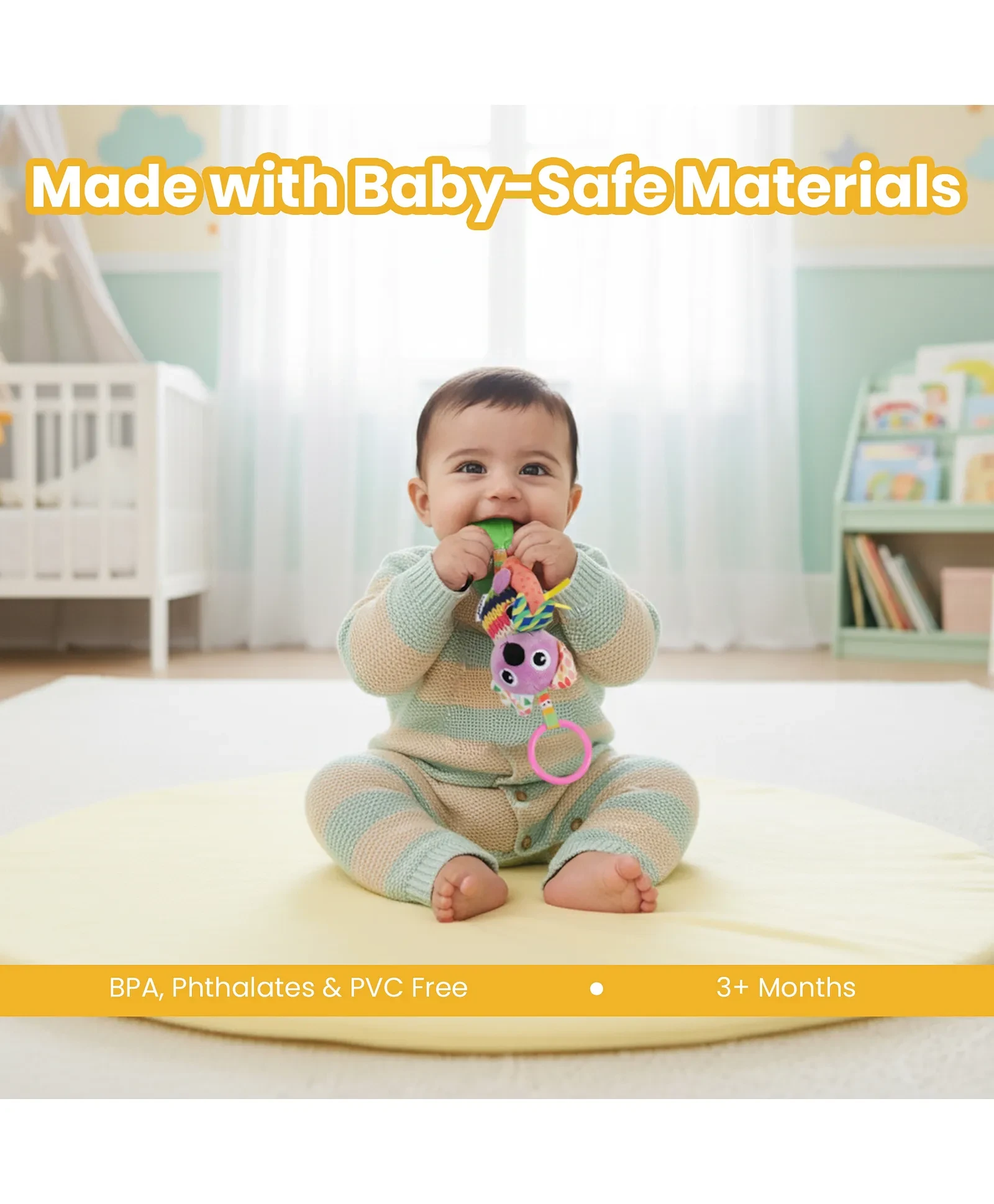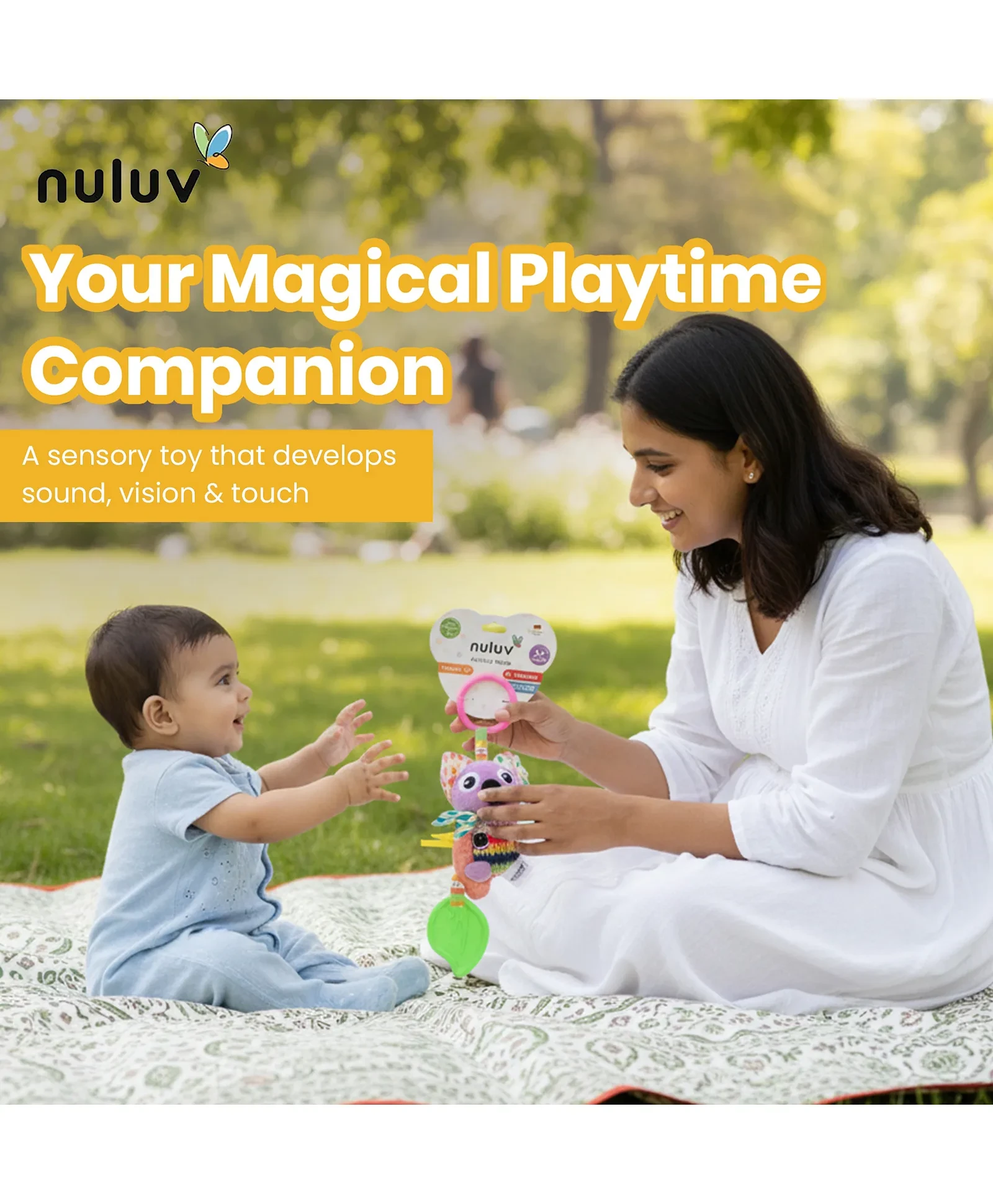 Oneliner Description-- Nuluv Activity Soft Toy for Babies, with queaker,teether, crinkle fabric that makes a fun sound when touched, adding an extralayer of sensory play.Safe and Cuddly Infant Toy for 3+ Months