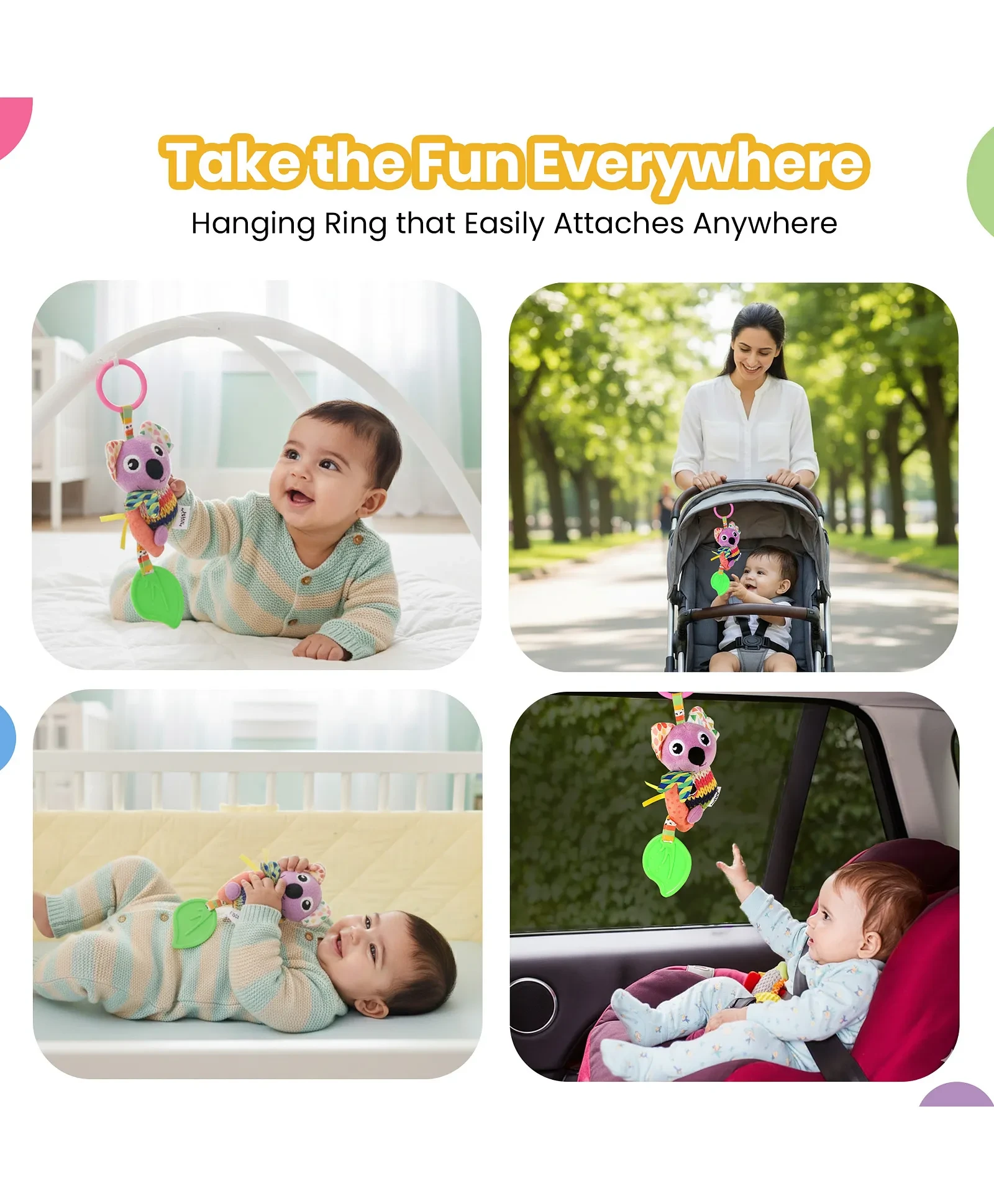 4. The hanging ringmakes it easy to attach the koala to strollers, car seats, or cribs foron-the-go fun.