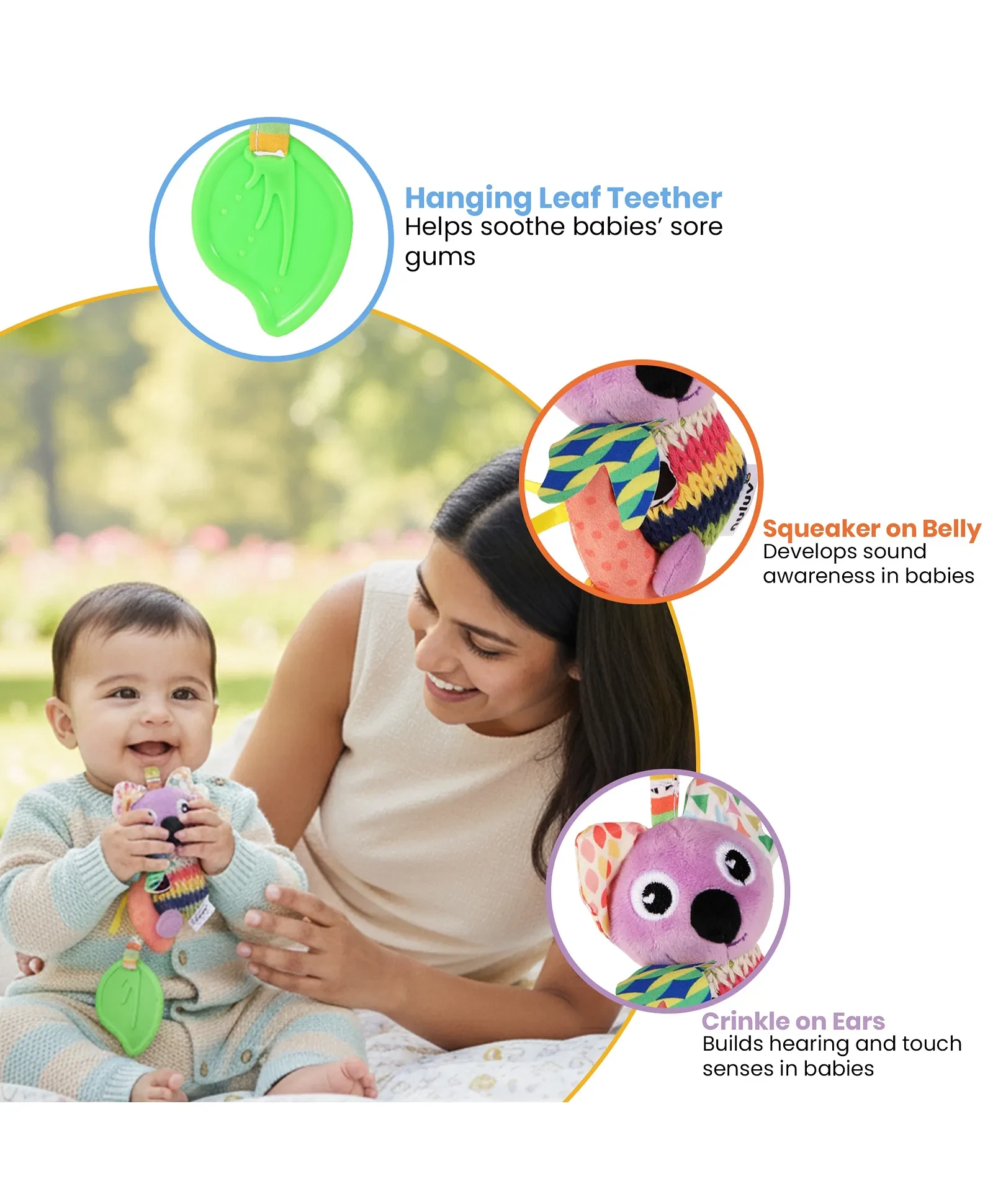 1. The squeakerinside the koala makes a fun sound when pressed, encouraging babies to interactand develop their senses.