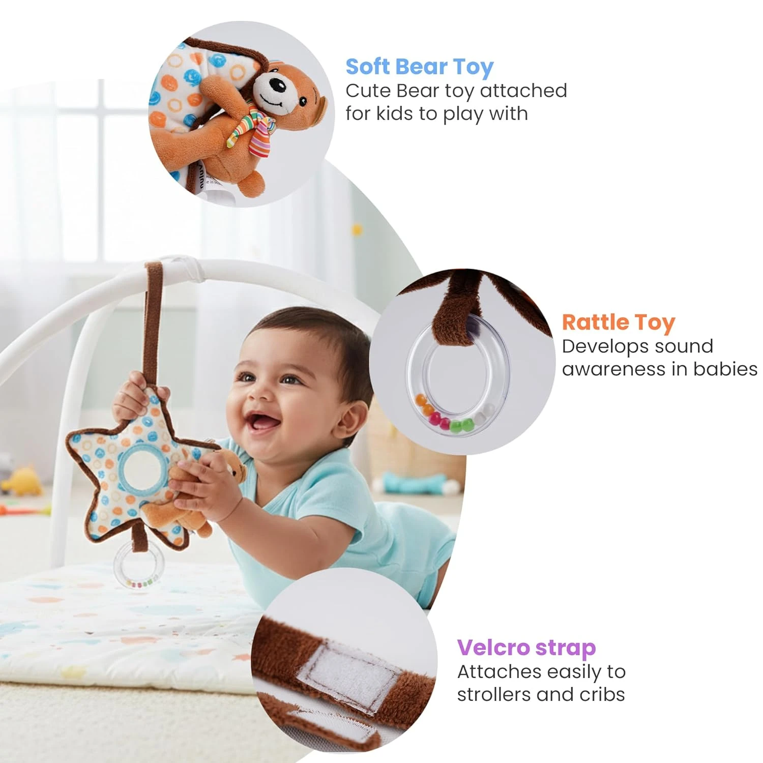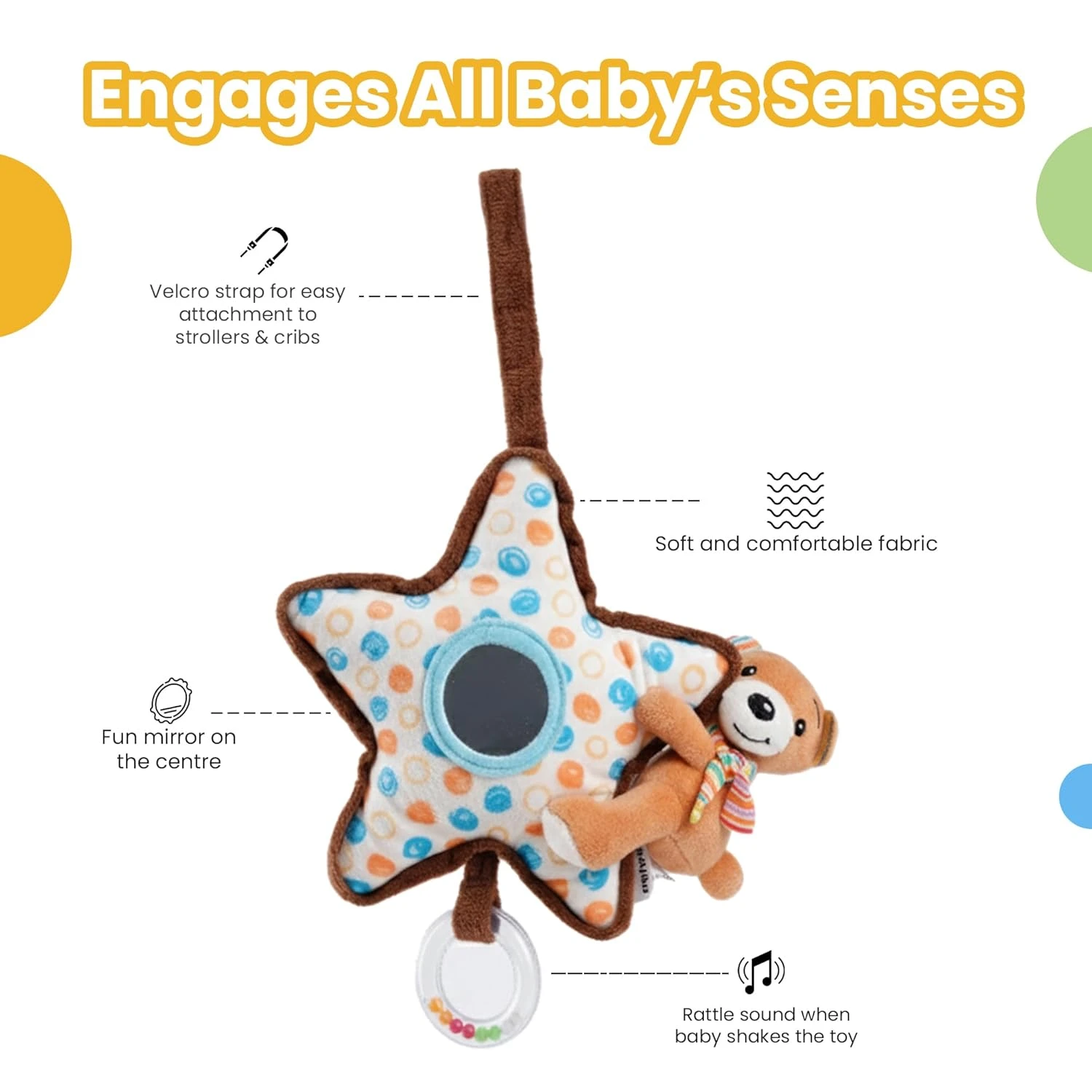The Nuluv Bear on Star Soft Toy is a dreamy companion designed to comfort, engage, and delight your baby. Featuring an adorable bear resting on a plush star, this soft toy is perfect for cuddles, gentle snuggles, and imaginative play. Crafted from high-quality baby-safe fabrics, it feels incredibly soft on delicate skin and is ideal for everyday use. A soothing rattle inside keeps little ones entertained while supporting early auditory development. The toy also includes a baby-safe mirror, encouraging visual exploration, curiosity, and early self-recognition, key elements of sensory growth. Lightweight and easy for tiny hands to grip, the Bear on Star toy is perfect for play at home or on the go. Whether attached to a stroller, placed in a crib, or carried around during playtime, it offers comfort, engagement, and developmental benefits in one snuggly package. Thoughtfully designed and irresistibly cute, it makes an excellent soft toy for newborns and a wonderful gift for babies aged 3 months and above.