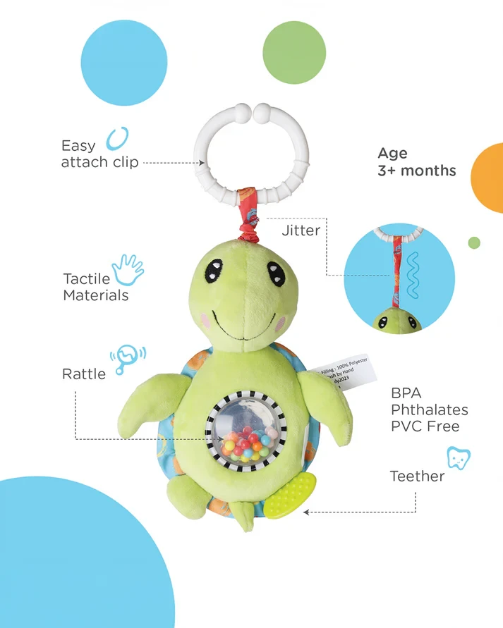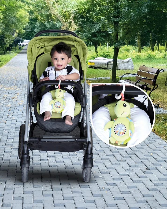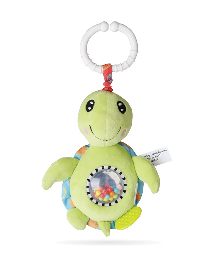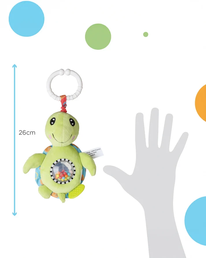 This delightful tortoise-inspired toy is perfect for babies aged 3 months and above. It features a playful jittery mechanism that activates gentle vibrations when pulled or triggered—encouraging interactive play. Its right leg doubles as a teether for soothing teething gums, while a rattle hidden in its belly enriches the sensory experience. Complete with a convenient C‑clip for easy hanging and storage, this charming turtle aids both playtime fun and developmental growth.