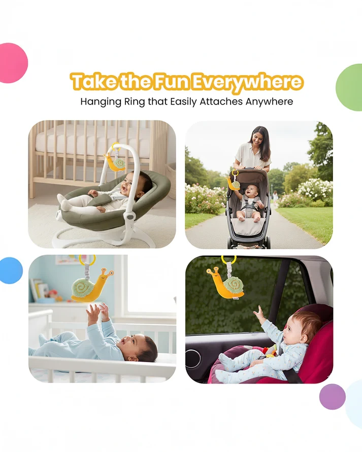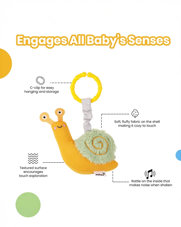 Nurture your baby's curiosity and sensory skills with this adorable snail rattle buddy. Specially designed for infants 3 months and above, its plush shell and playful colors invite endless tactile exploration. Lightweight and portable, it features a secure C-clip for easy attachment on strollers or diaper bags, making it a perfect companion for playtime wherever adventure takes your little one.