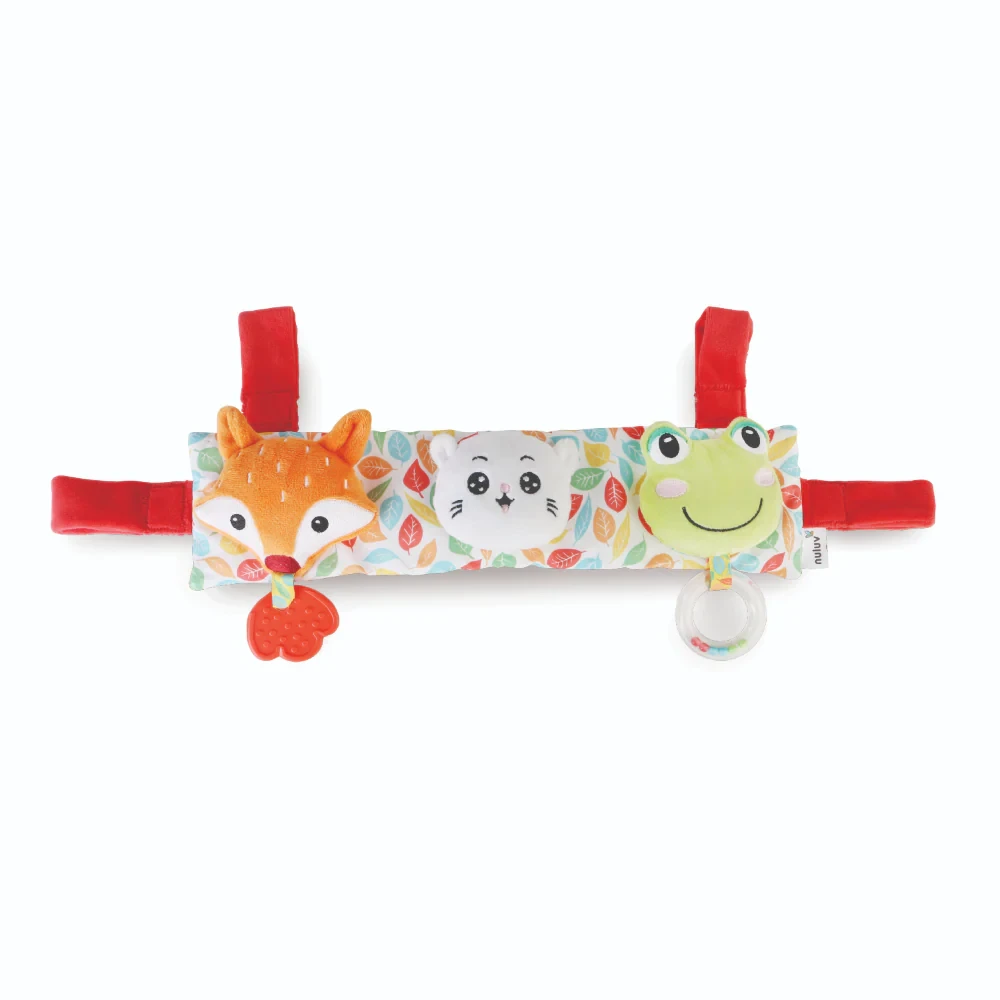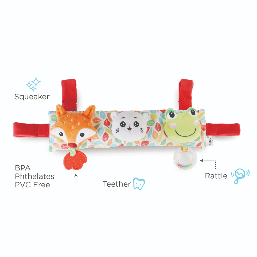 1. With three cute characters – a fox, a cat and a frog – attached to a multi-colored soft fabric, the toy adds vibrancy to any baby furniture! It comes with a teether that helps in the baby’s teething process. A delightful rattle encourages the baby to explore, grasp and shake.