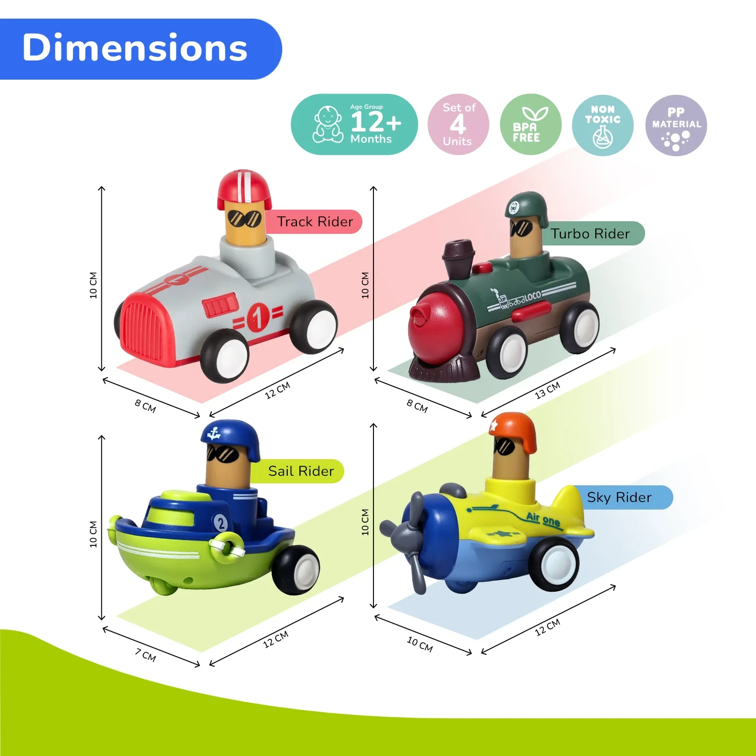 Set of Four: It comes in a set of four to have a group play or race, namely, Track Rider, Sky Rider, Turbo Rider, and Sail Rider. They all come in very attractive colours and creative designs to keep the little one engaged.