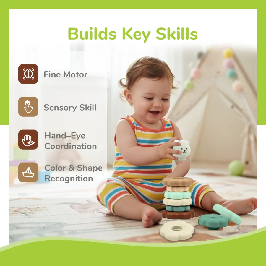 Essential Skill Development: This toy is a developmental powerhouse, as it provides hand-eye coordination through the placement of rings, offers sensory stimulation through various texture, shape, and size exploration, and helps them recognize different colors and shapes.