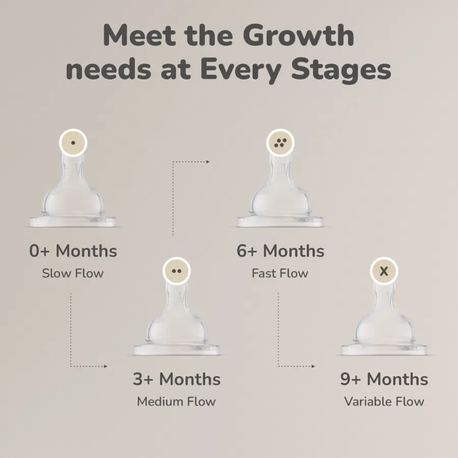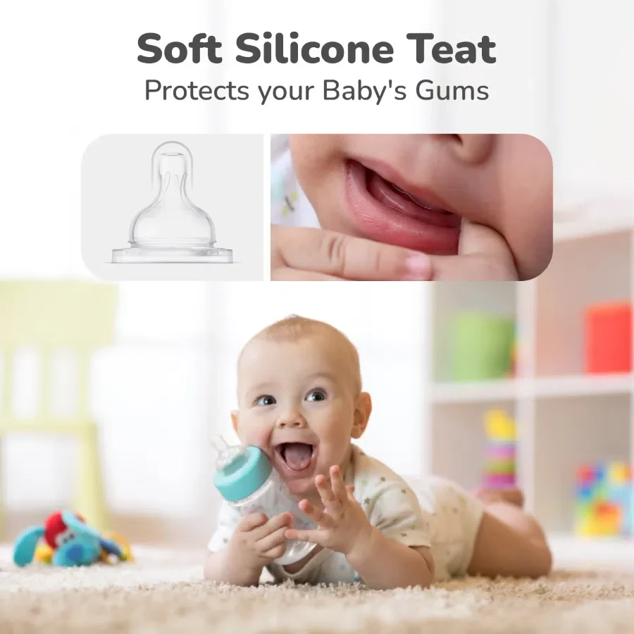 Super Soft Silicone Nipple: Made with soft silicon, the nipple mimics the look and feel of the breast and is best for the gums of babies