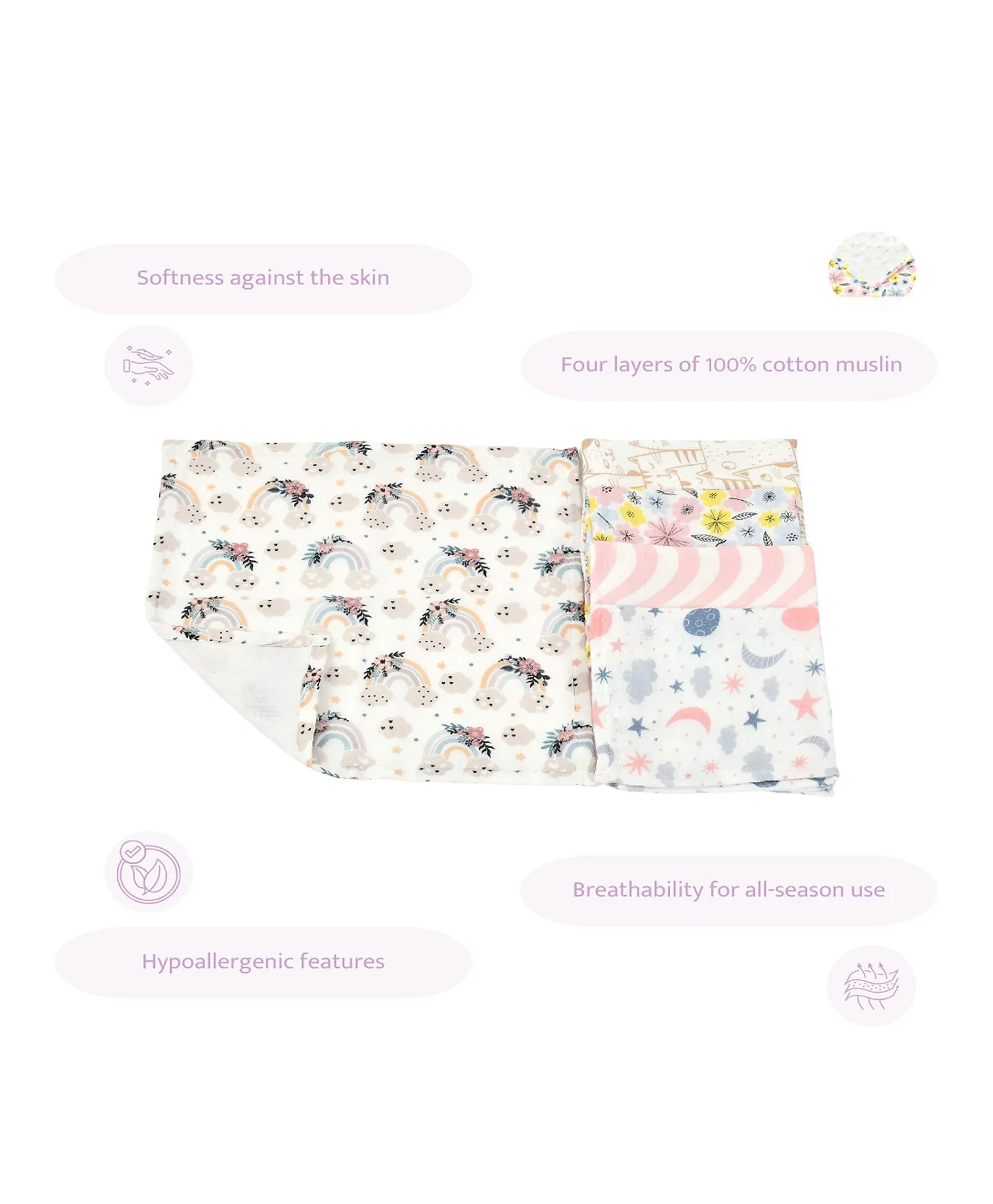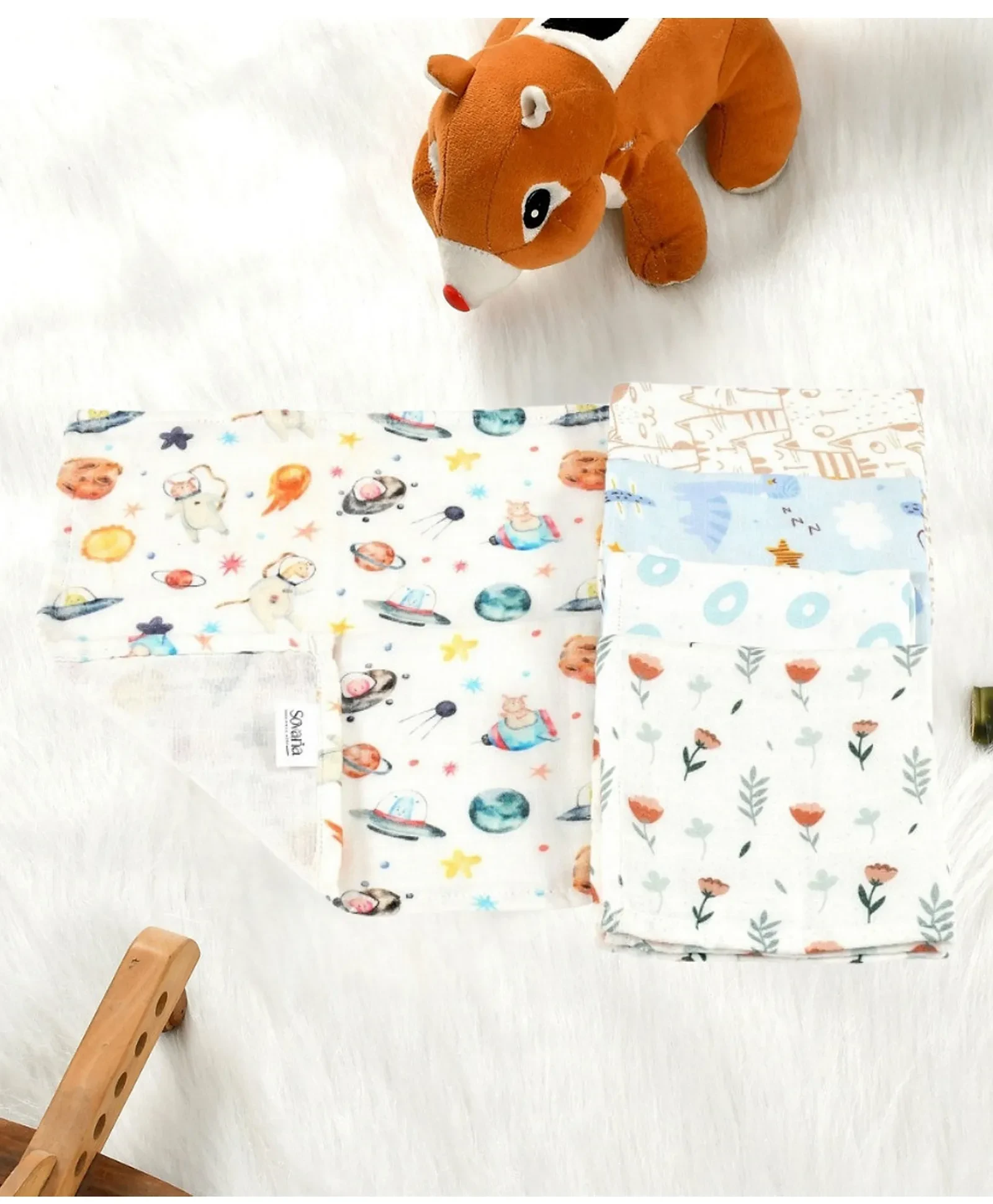 Our digitally printed washcloths are made of fourlayers of 100%cottonmuslin, making them super soft against your child's skin. It is soft and superbreathable. You can use it multiple times without worrying about the awful wettowel smell in seasons that don't allow you to wash them very frequently. Theyare small enough to be portable. They are hypo-allergic, extremely soft, andgentle, against your baby's delicate skin. Theyare 2-in-1 pieces of fabric that you can use as a wash-up cloth or as a face towelto keep your baby safe between the bathroom and changing into fresh clothes.They can easily be washed in the washing machine. Our gender-neutral designensures you can use them both for baby girls or baby boys. We recommend you towash once before use. Wash with similar colours. Lightweight and superabsorbent, Sovana has designed washcloths that endure endless washing, 100%cotton ensures our washcloths become softer with each wash.