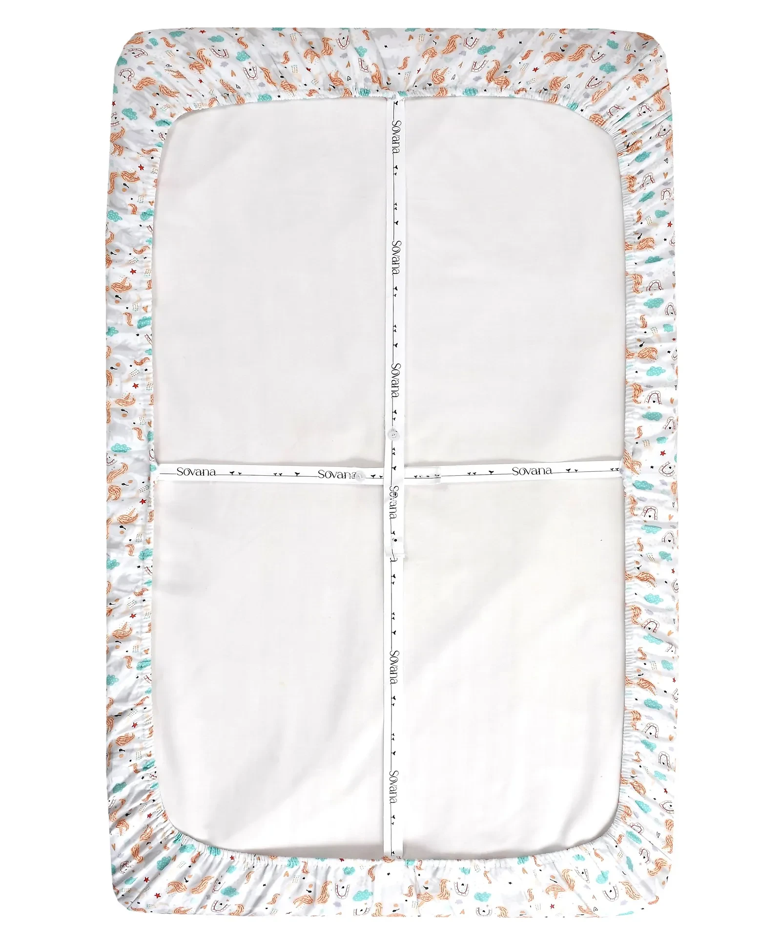 A cribis a baby's ultimate personal space where she should feel most comfortable. So,she can have a good night's sleep and afternoon naps and not become littlemiss-cranky-pants. Our fitted crib sheets are easy to tuck in making you andyour baby fuss-free. They are made of 100% cotton satin fabric giving your babya smooth and soft surface to sleep on. Digitally printed with azo-free dyes,Sovana's Fitted cribsheets are heaven-sent. They are hypo-allergic ensuring irritation-free 24x7comfort for your baby. With bright colours and multiple designs to choose fromSovana has designed its fitted crib sheets to complement a multitude of babyspaces. As a newborn's mother, you haveenough as it is to worry about. Sovana has designed the fitted crib sheets withadditional straps at the back to fit to all kind of baby mattress. Sovana hasdesigned them for you to easily mix and match and give immense comfort to yourbaby. Our bright designs also ensure your baby has a beautiful surface to getthat brain-developing nap when sleeping and neurobiology-developing play timewhen awake.