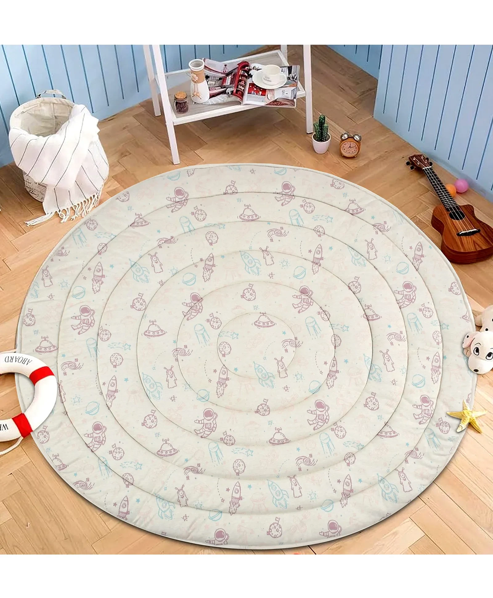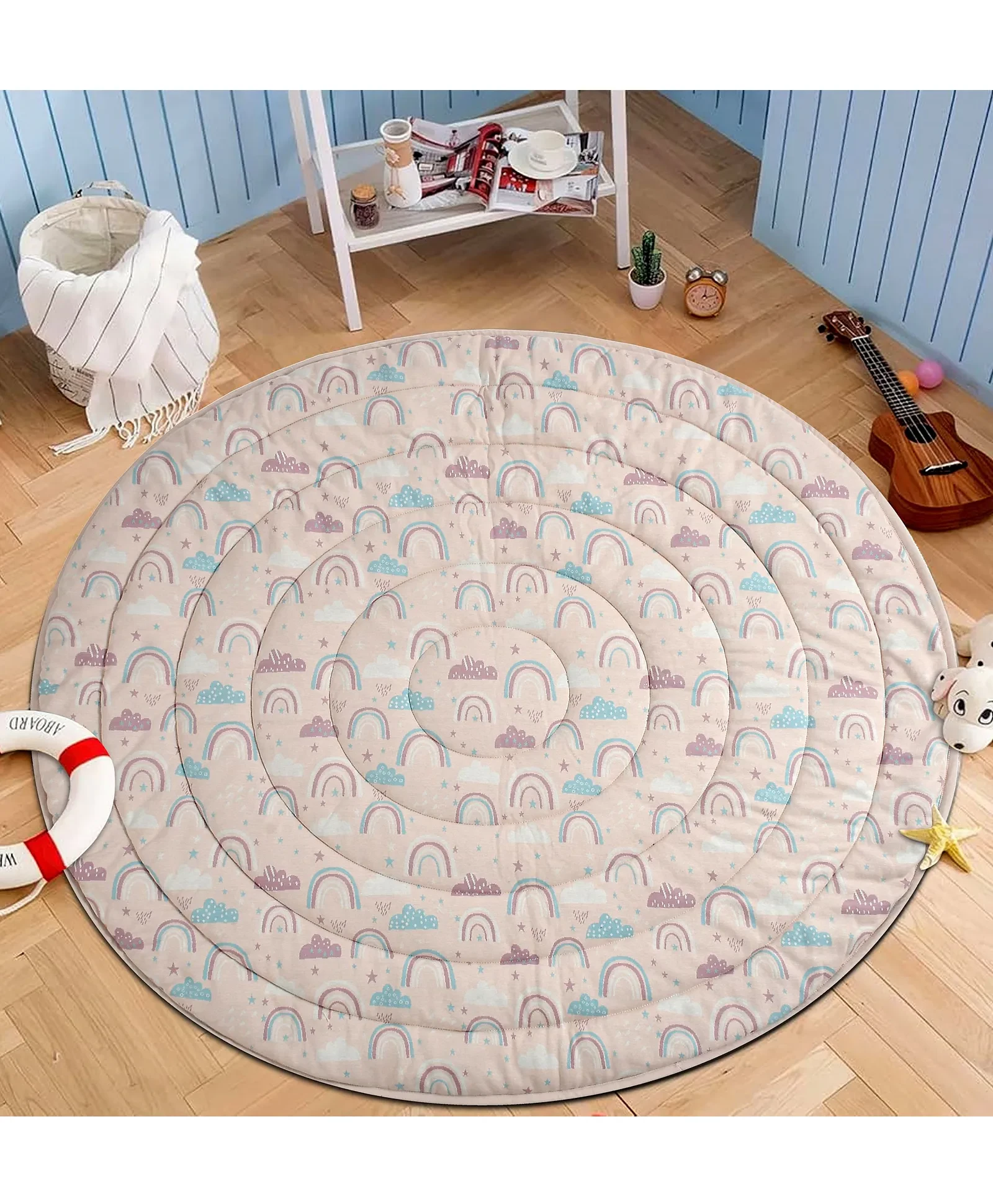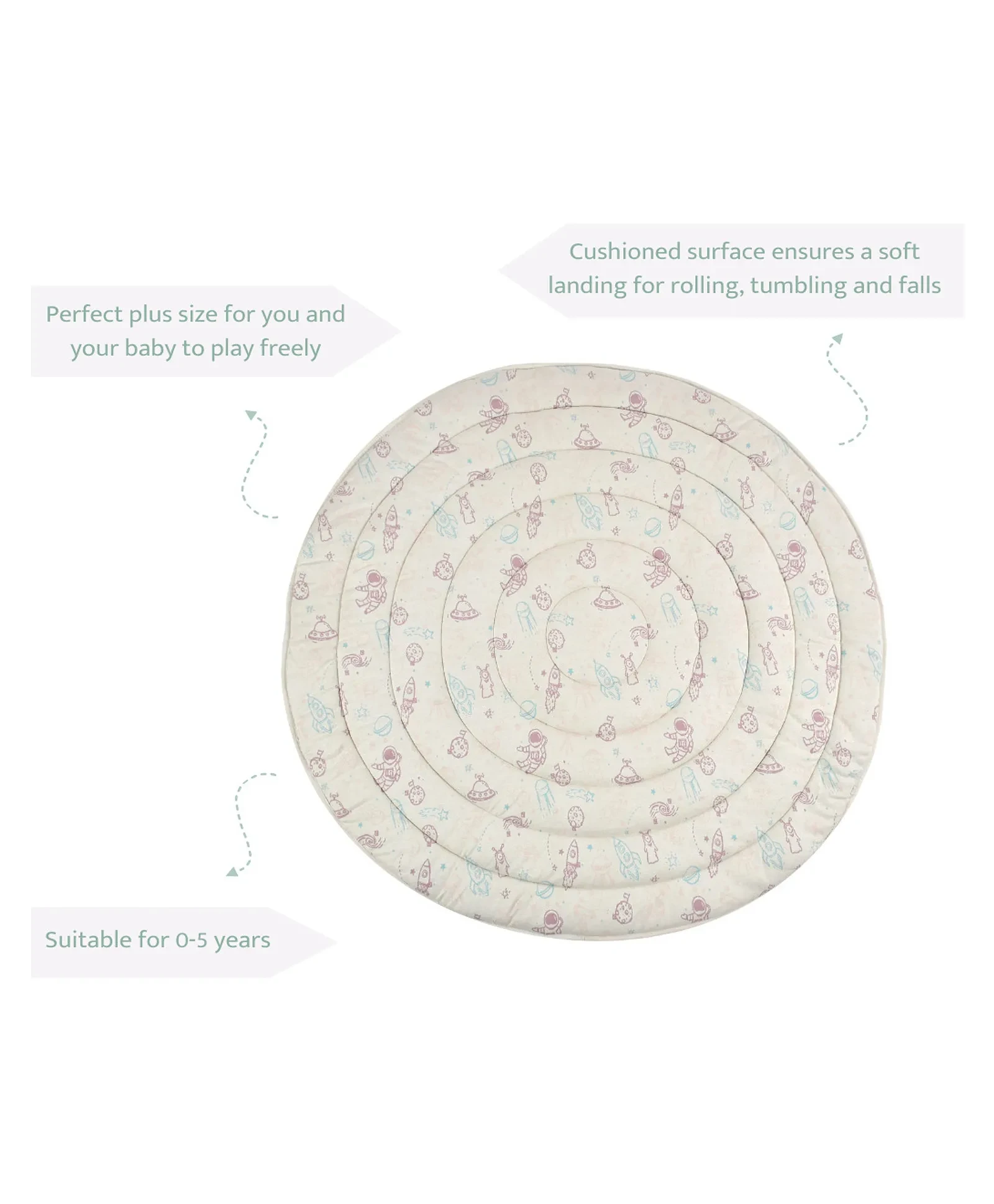 Playtimeis crucial for your baby's growth. You are your baby's first playmate. Play isa fun way for you two to bond. Play is also how babies learn about themselvesand other people. It helps build their confidence, relationships, and basicskills. So they need lots of playtime every day. Our Quilted Playmat isdesigned to enhance your precious time with your baby. It is soft for your babyto land on. It is hypoallergenic, sturdy and durable. It is available in 2attractive designs that you can choose from. It is made with super soft 100%cotton knitted fabric. It is large, approx 130 cm in diameter to give yourchild plenty of space to play and learn. It has multiple uses. You can use iteither as a Playmat full-time or as a bedding and as a picnic spot mat. It ismachine washable. It can be used for children up to 2 years.