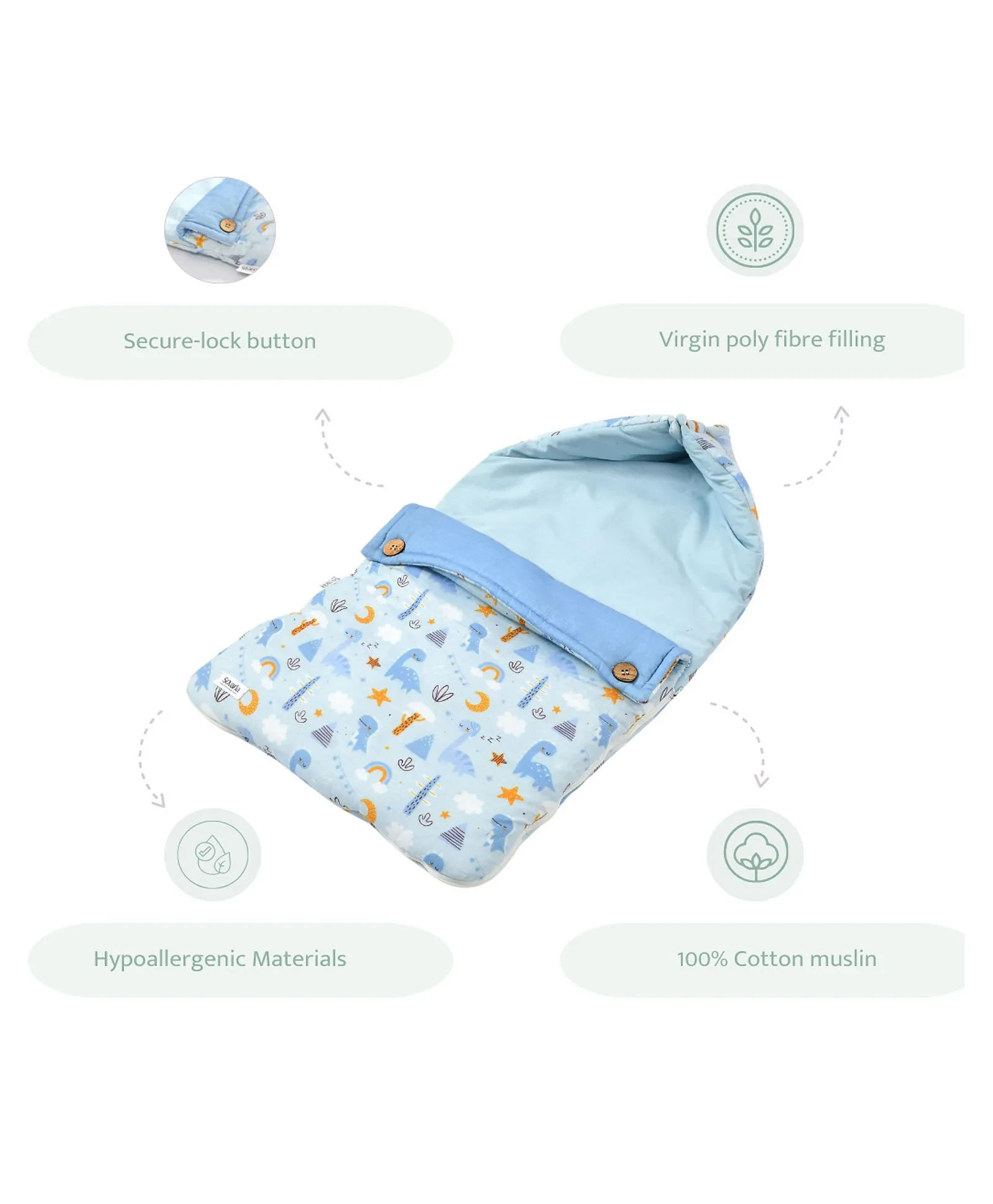 Sleepis a very important part of your baby at this young age and it must continuewithout any disturbances come what may! To protect your baby's sleep we havedesigned hypoallergenic 100% cotton muslin carrier nests, ensuring supremecomfort to your child and to you even when you are travelling. Now travellingwith your baby is no longer a far-fetched dream. With an external case made ofsuper delicate muslin fabric and an internal filling made of poly fiber, ourMuslin Carrier nest is cotton candy comfort on the go. It is designed to keepyour baby cozy at all times while enjoying travel with their parents. Thishooded nest on-the-go ensure your baby is comfortable head to toe at all times. They are made of super soft muslin cloth and come in various patterns to choosefrom. There's a zip access inthe side to keep the baby secure while handling. Ergonomically designed ourcarrier nests are one hundred percent machine washable. However, we recommendyou use mild detergent and a gentle cycle to retain its soft delicateness. Itis designed keeping multiple washes in view, so it can be a long durablecompanion to your baby's delicate initialjourney. It makes up a wonderful companion on-the-go as well as a useful giftto any mom-to-be's baby shower.