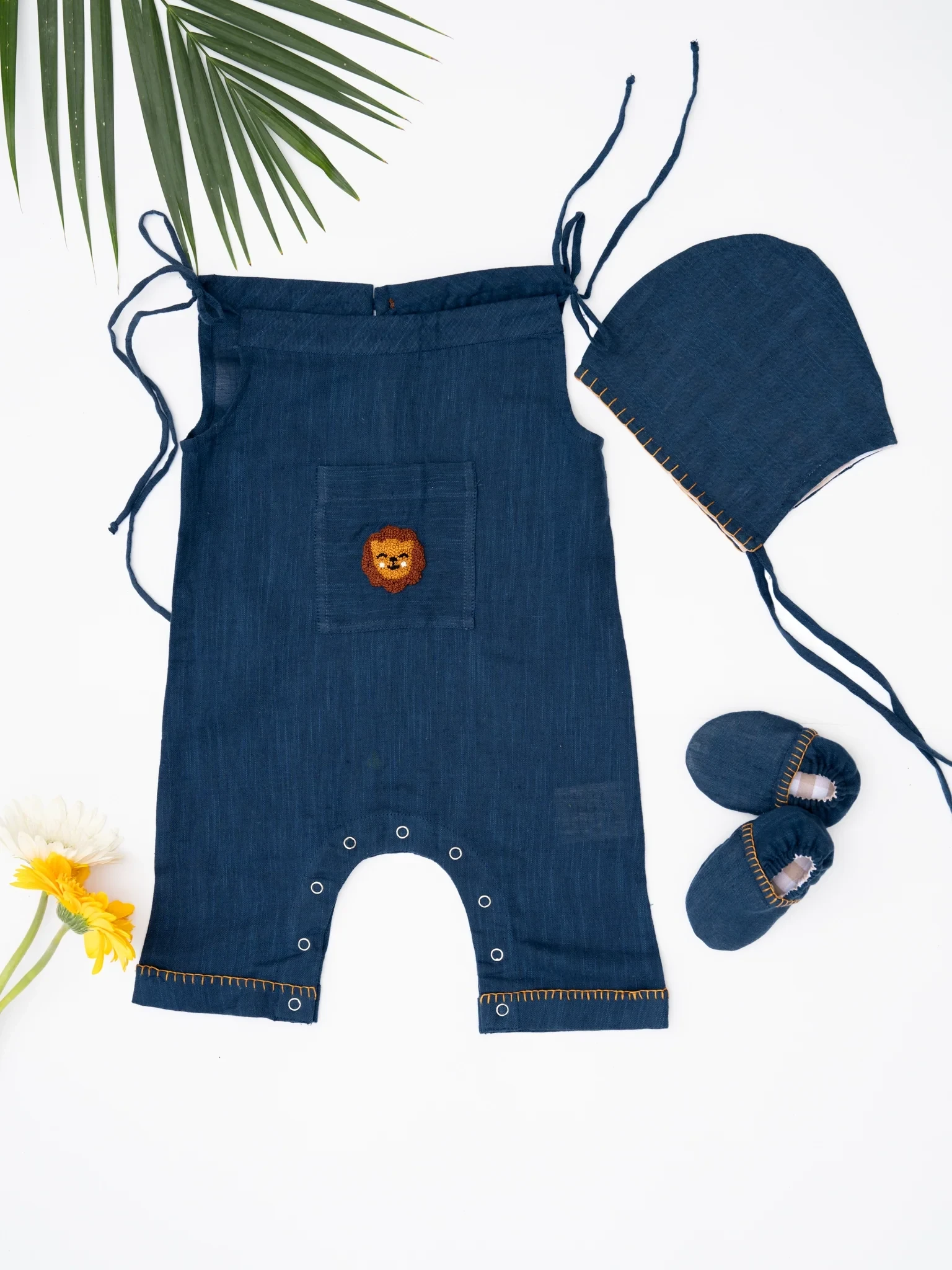 Baby Romper: The romper is a perfect blend of soft organic cotton and undyed fabric making it gentle on babies' skin. The tiny-teeny florals add elegance and are hand embroidered by woman artisans. The shoulder strings ensure the length can be adjusted as the little one grows. The crotch button closure ensures fuss-free diaper changing.